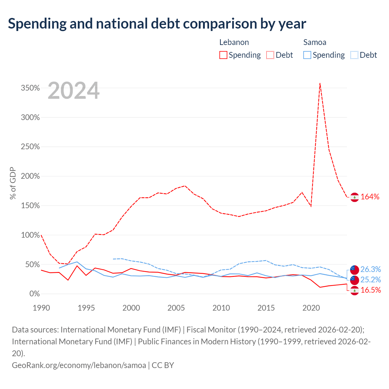 Lebanon has $38.7B in government debt (163.8% of GDP), compared to $296M (25.2% of GDP) in Samoa.