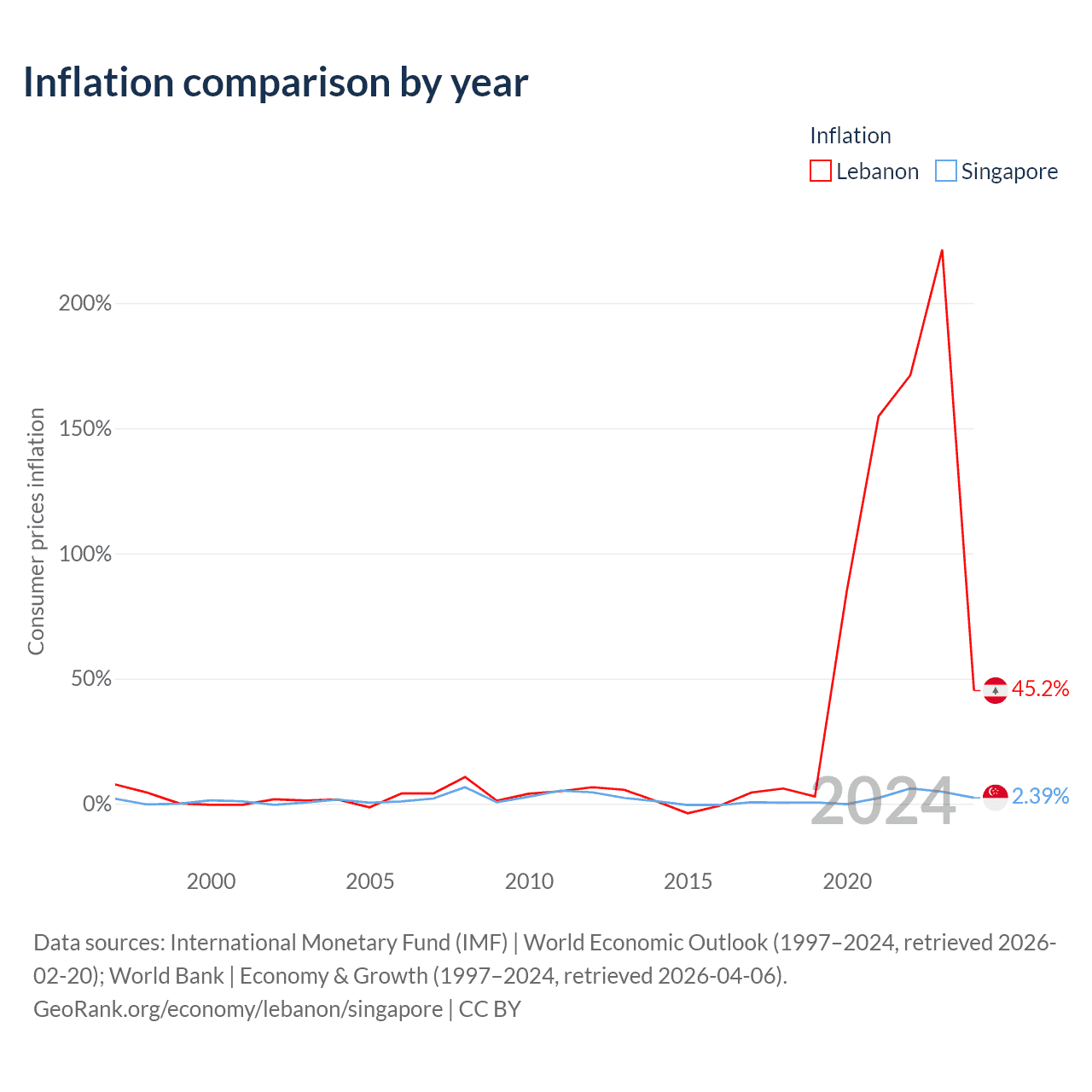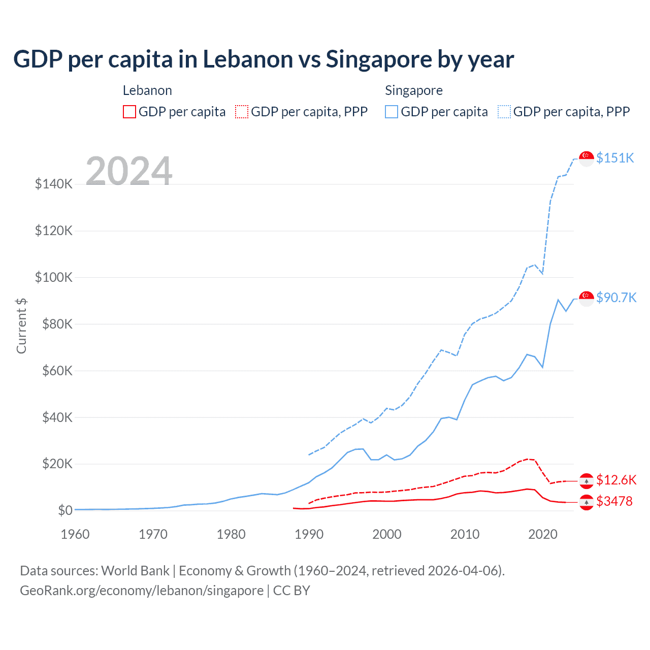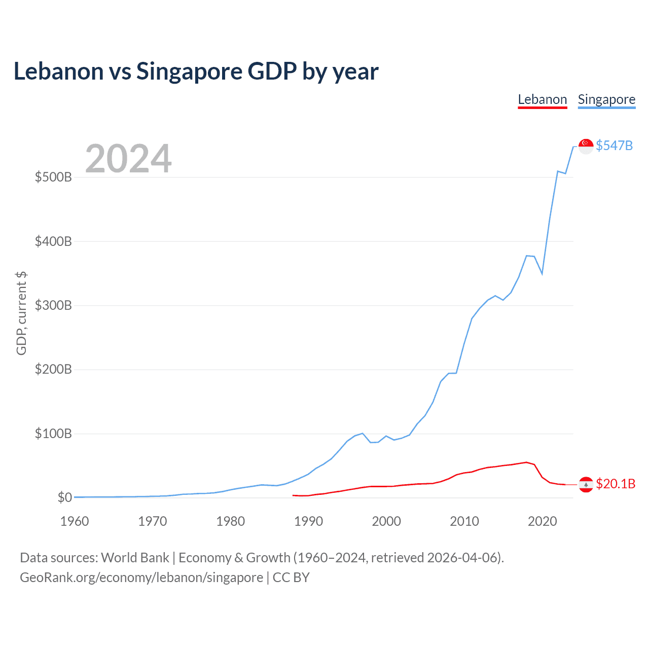 Lebanon has a GDP of $20.1B compared to $547B for Singapore, ranking 128/197 and 28/197 by economy size, respectively.