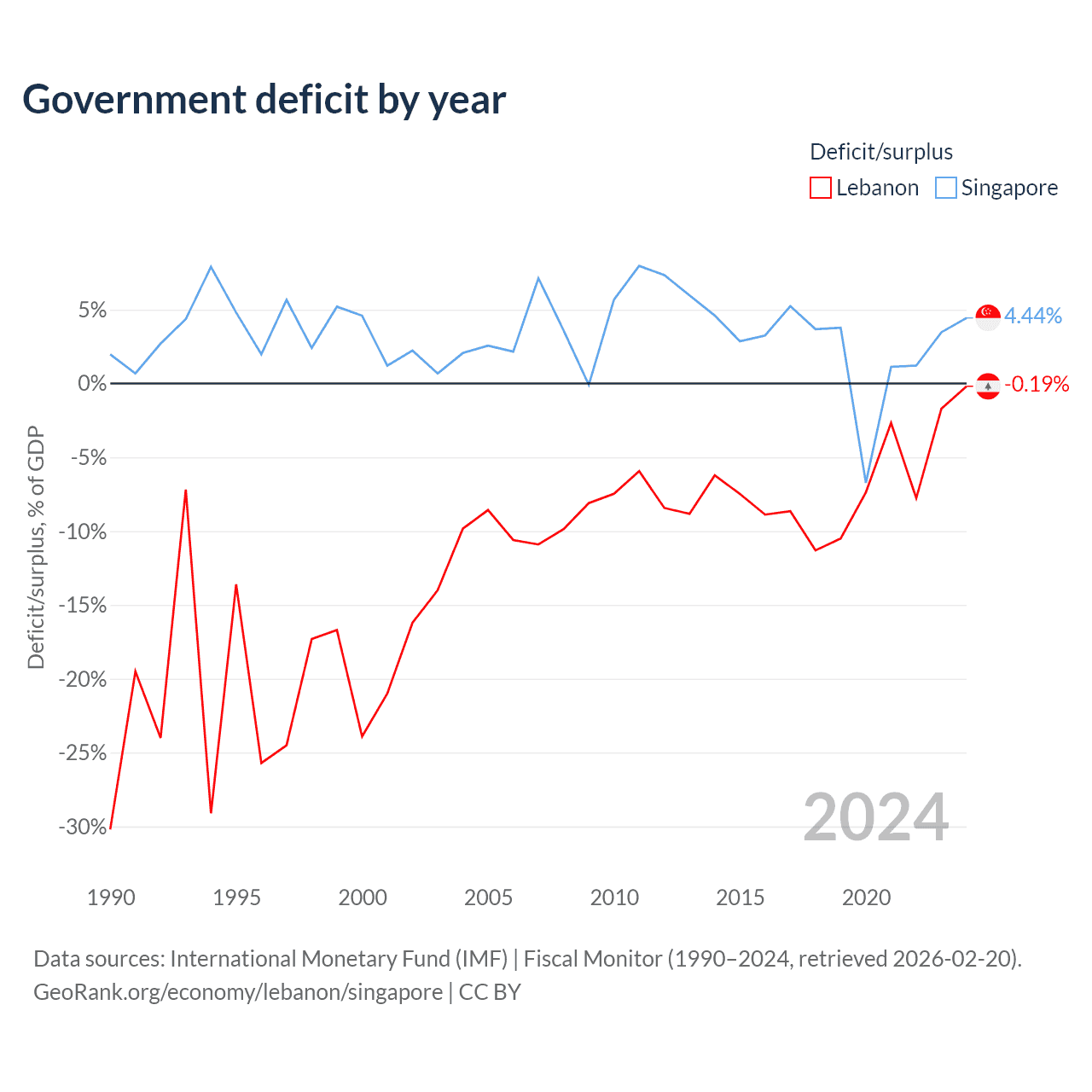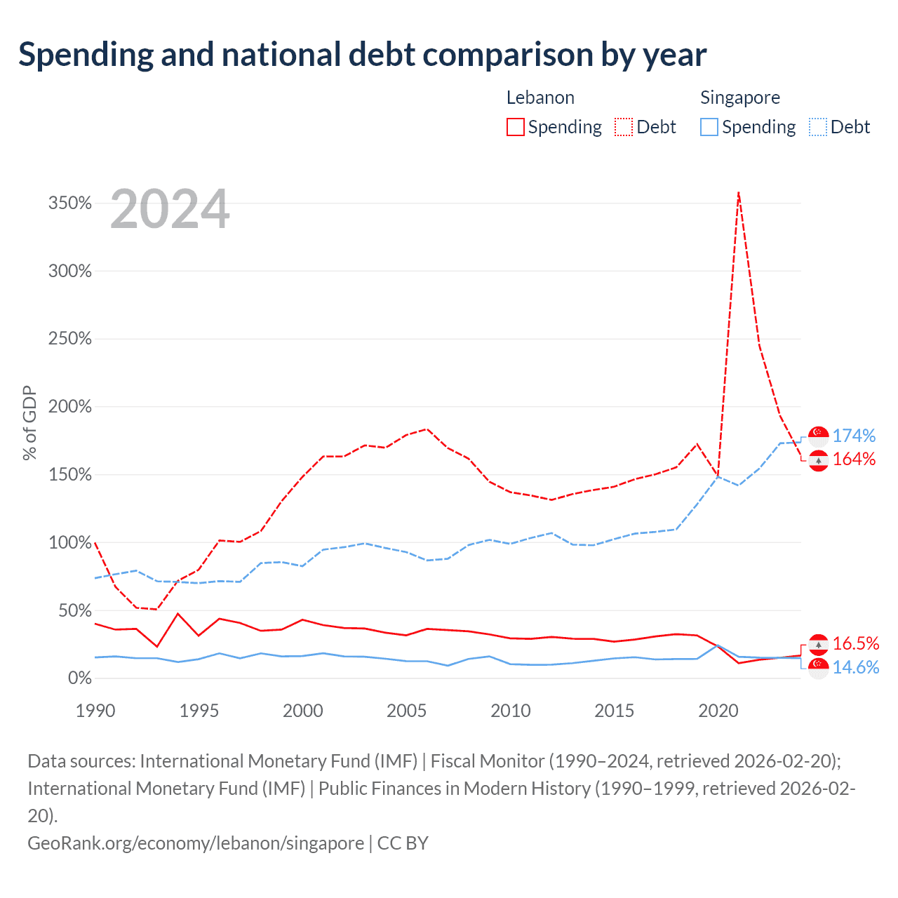 Lebanon has $38.7B in government debt (163.8% of GDP), compared to $950B (173.5% of GDP) in Singapore.