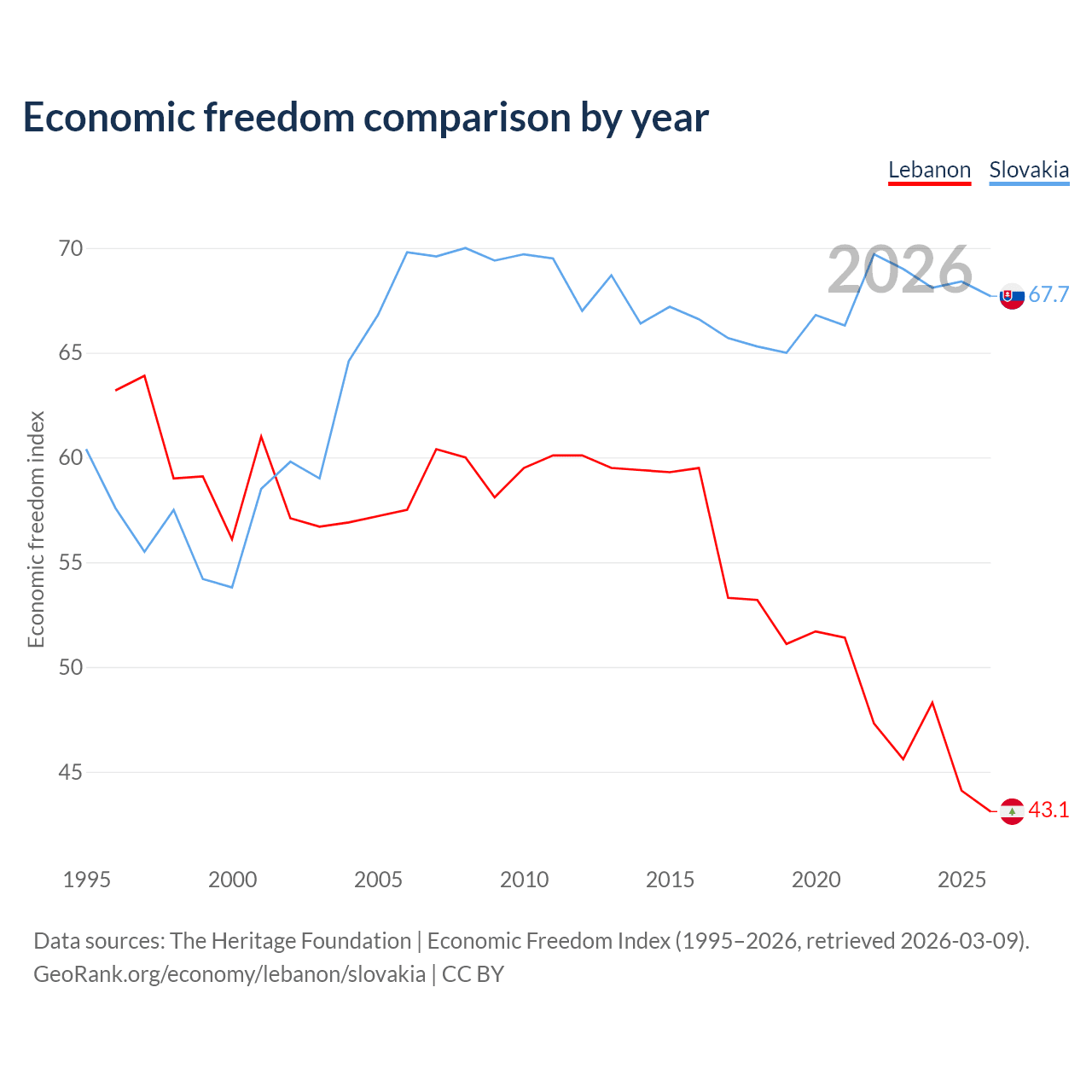 The Economic Freedom Index for Lebanon is 43.1, ranking 183/197, compared to 67.7 for Slovakia, ranking 54/197. The chart above displays a comparison of annual changes in economic freedom indexes.