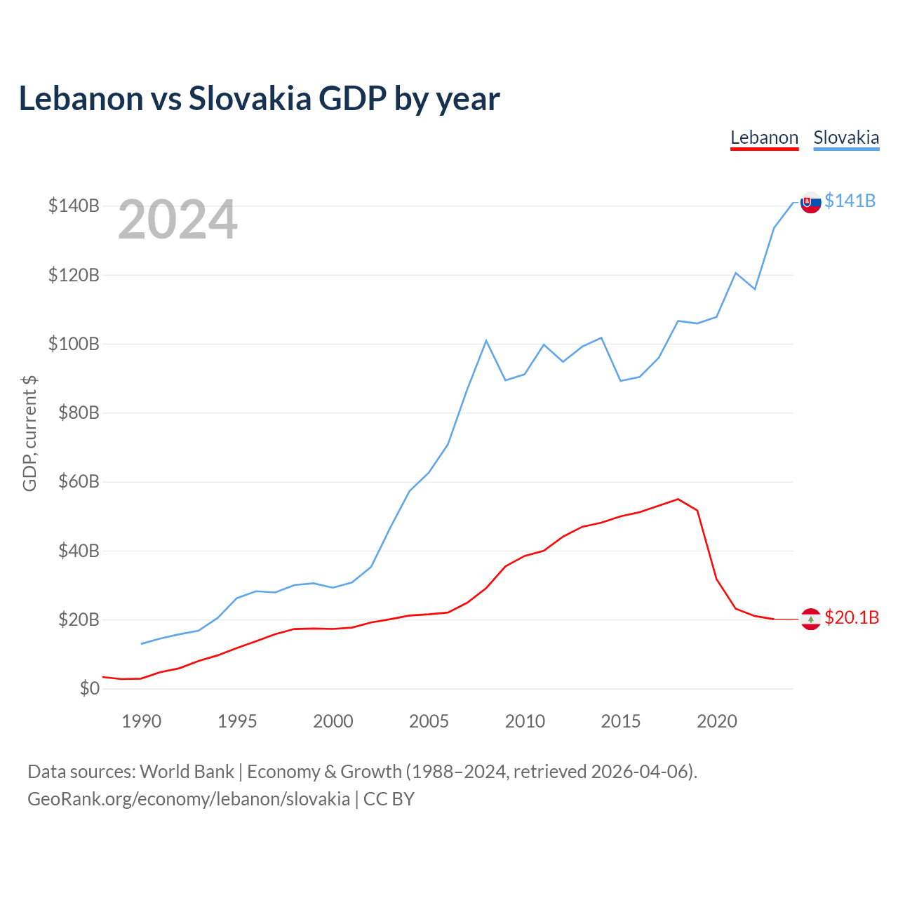 Lebanon has a GDP of $20.1B compared to $141B for Slovakia, ranking 128/197 and 61/197 by economy size, respectively.