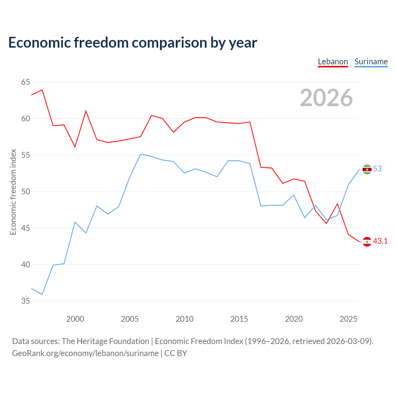 The Economic Freedom Index for Lebanon is 43.1, ranking 183/197, compared to 53 for Suriname, ranking 143/197. The chart above displays a comparison of annual changes in economic freedom indexes.