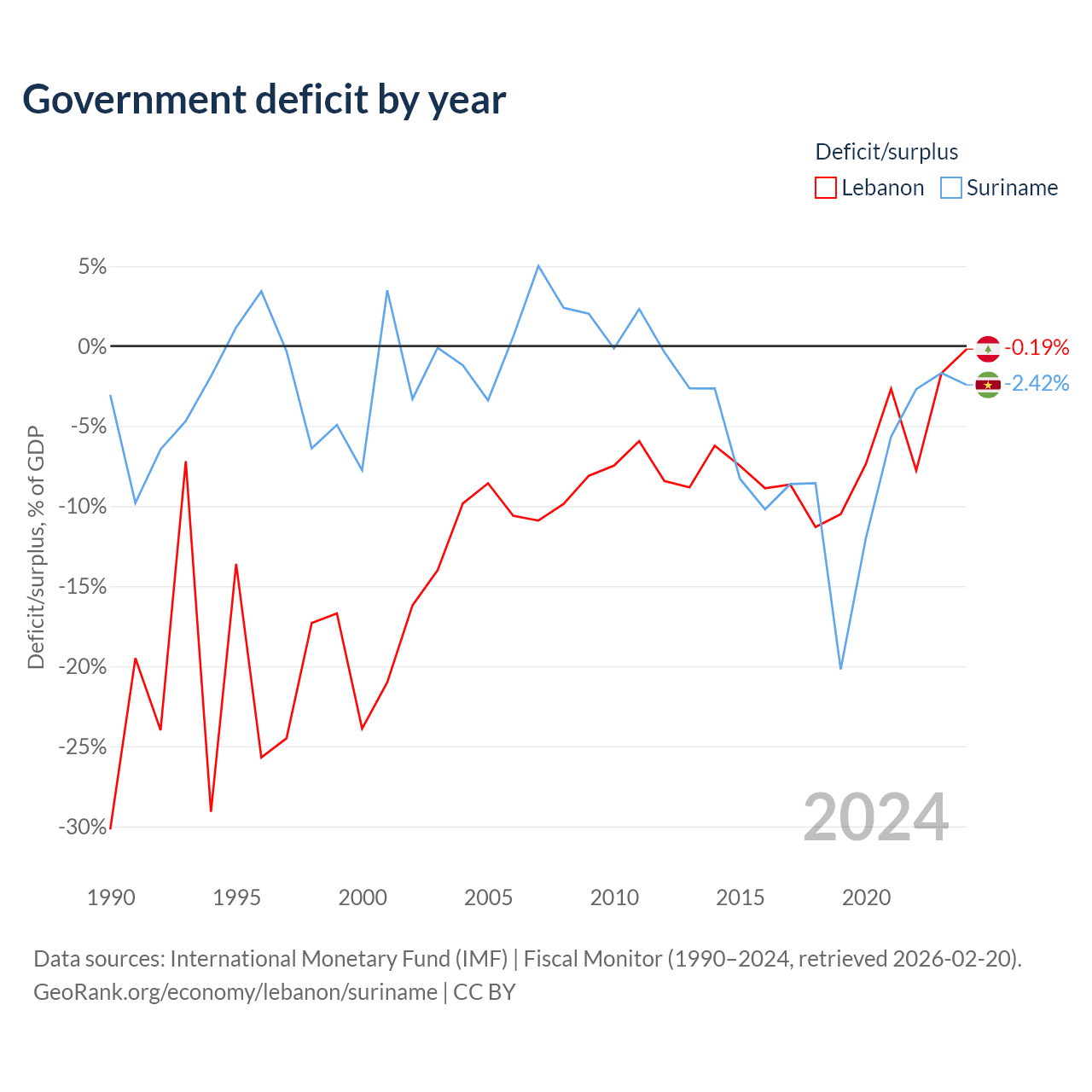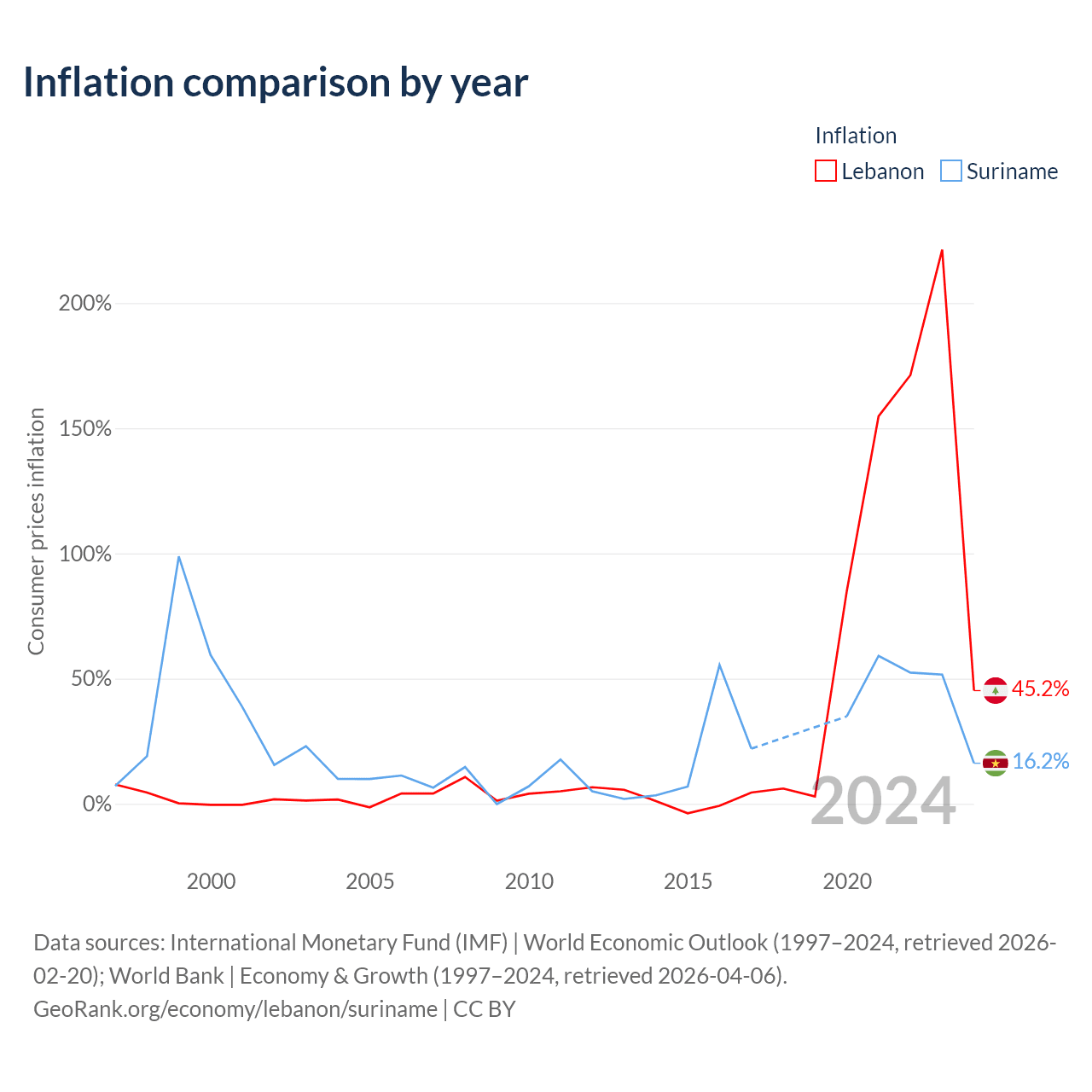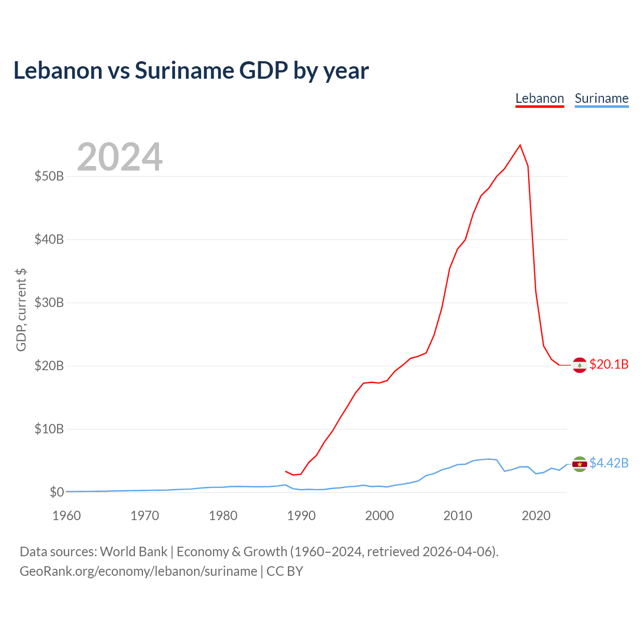 Lebanon has a GDP of $20.1B compared to $4.42B for Suriname, ranking 128/197 and 164/197 by economy size, respectively.