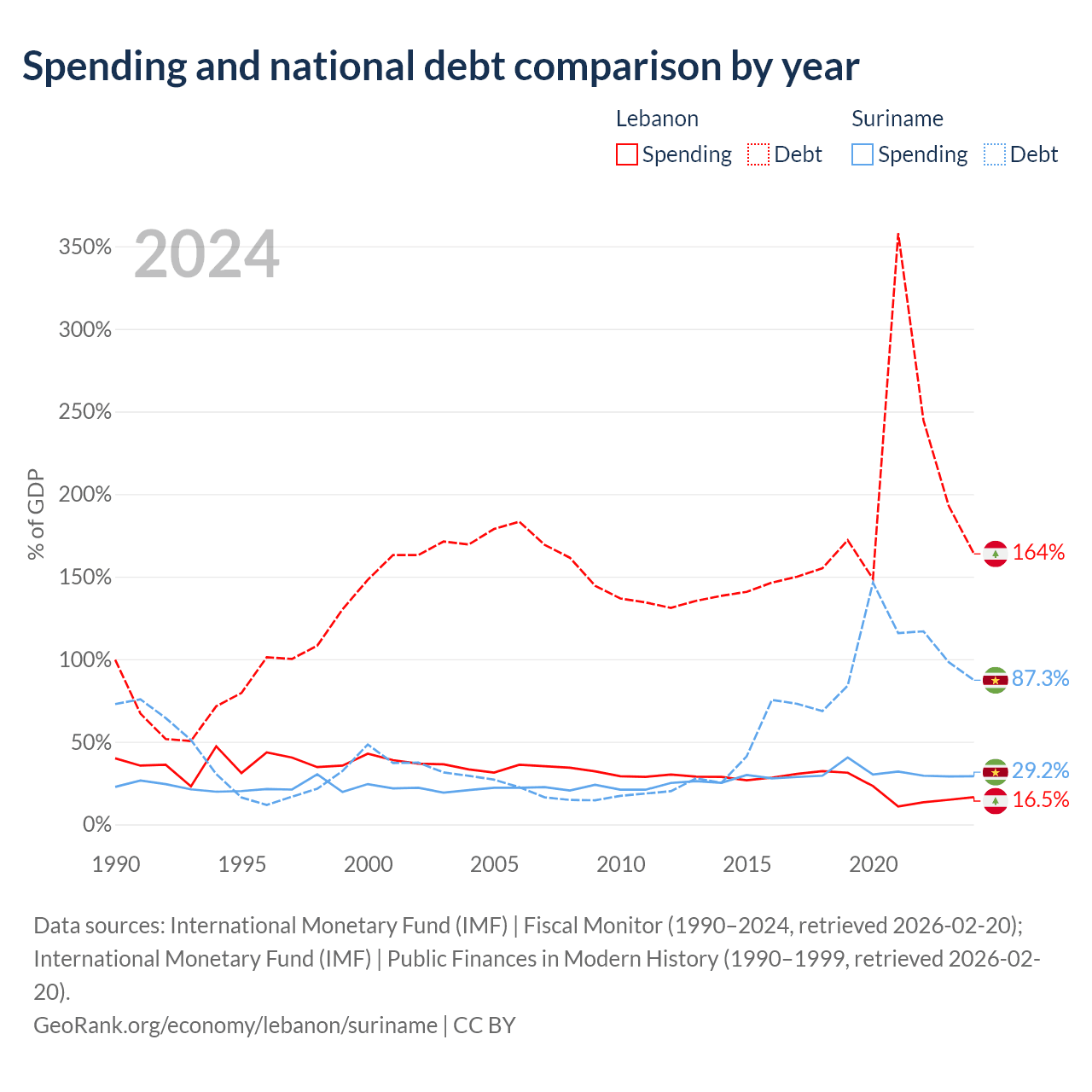 Lebanon has $38.7B in government debt (163.8% of GDP), compared to $3.86B (87.3% of GDP) in Suriname.