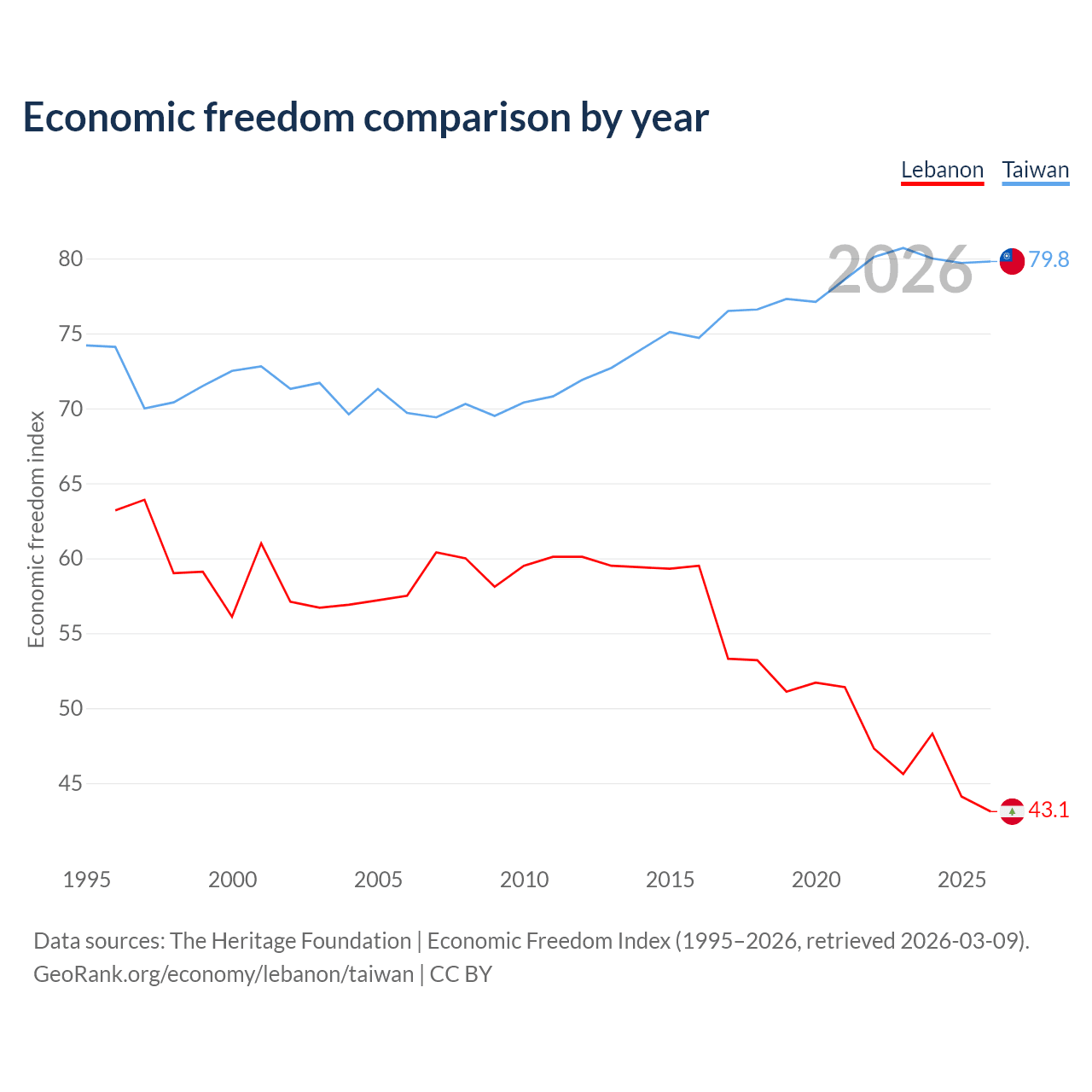 The Economic Freedom Index for Lebanon is 43.1, ranking 183/197, compared to 79.8 for Taiwan, ranking 6/197. The chart above displays a comparison of annual changes in economic freedom indexes.