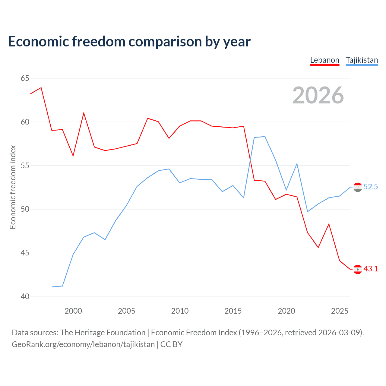 The Economic Freedom Index for Lebanon is 43.1, ranking 183/197, compared to 52.5 for Tajikistan, ranking 147/197. The chart above displays a comparison of annual changes in economic freedom indexes.