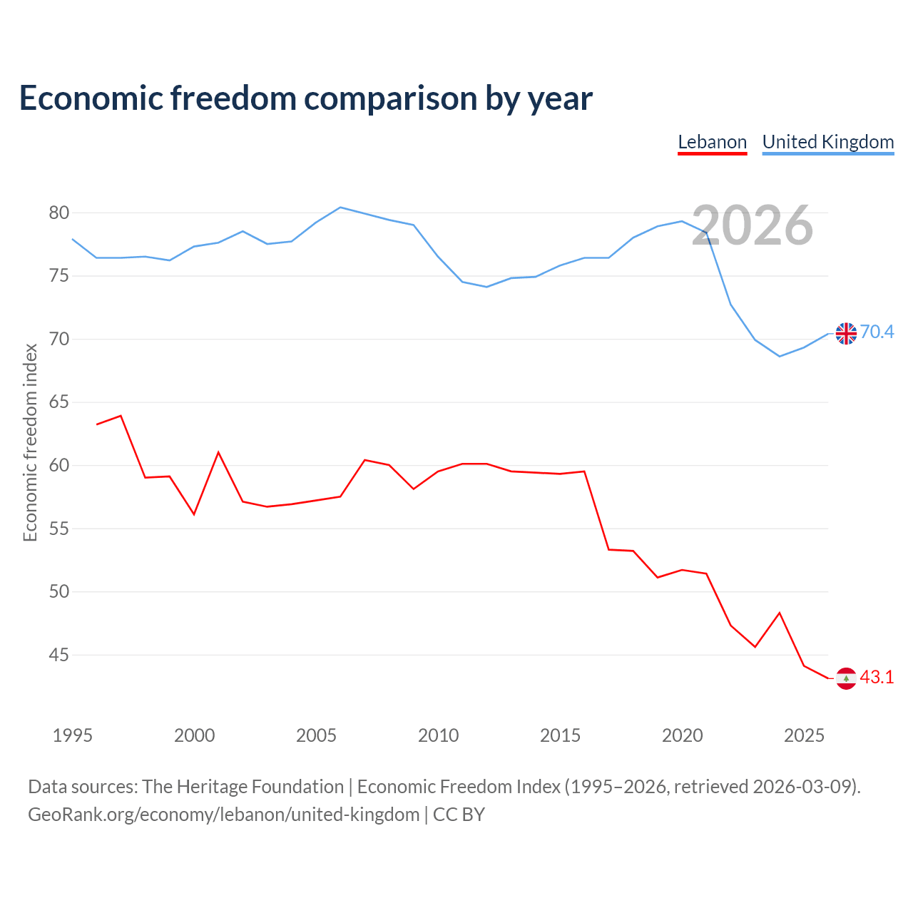 The Economic Freedom Index for Lebanon is 43.1, ranking 183/197, compared to 70.4 for the United Kingdom, ranking 35/197. The chart above displays a comparison of annual changes in economic freedom indexes.