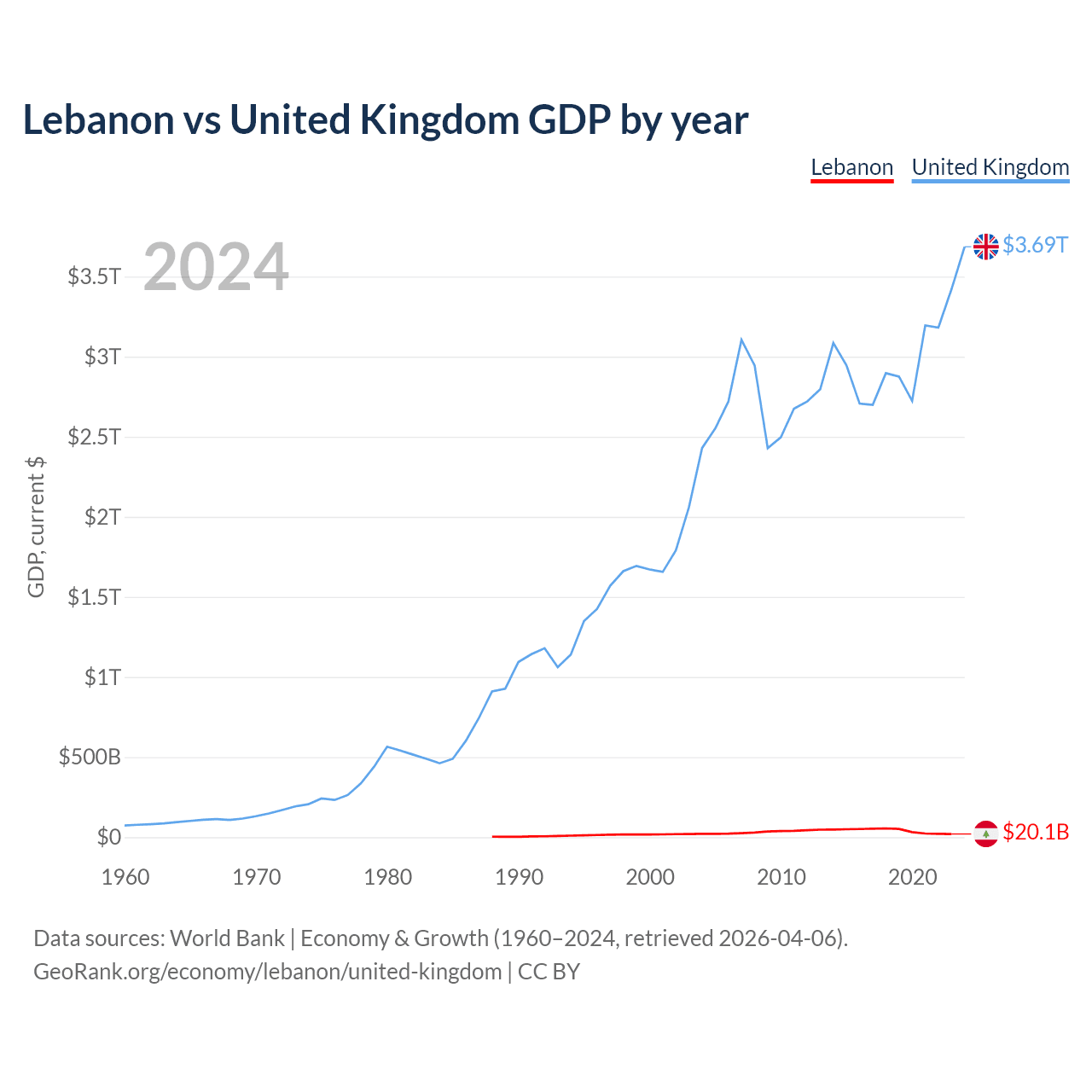 Lebanon has a GDP of $20.1B compared to $3.69T for the United Kingdom, ranking 128/197 and 6/197 by economy size, respectively.