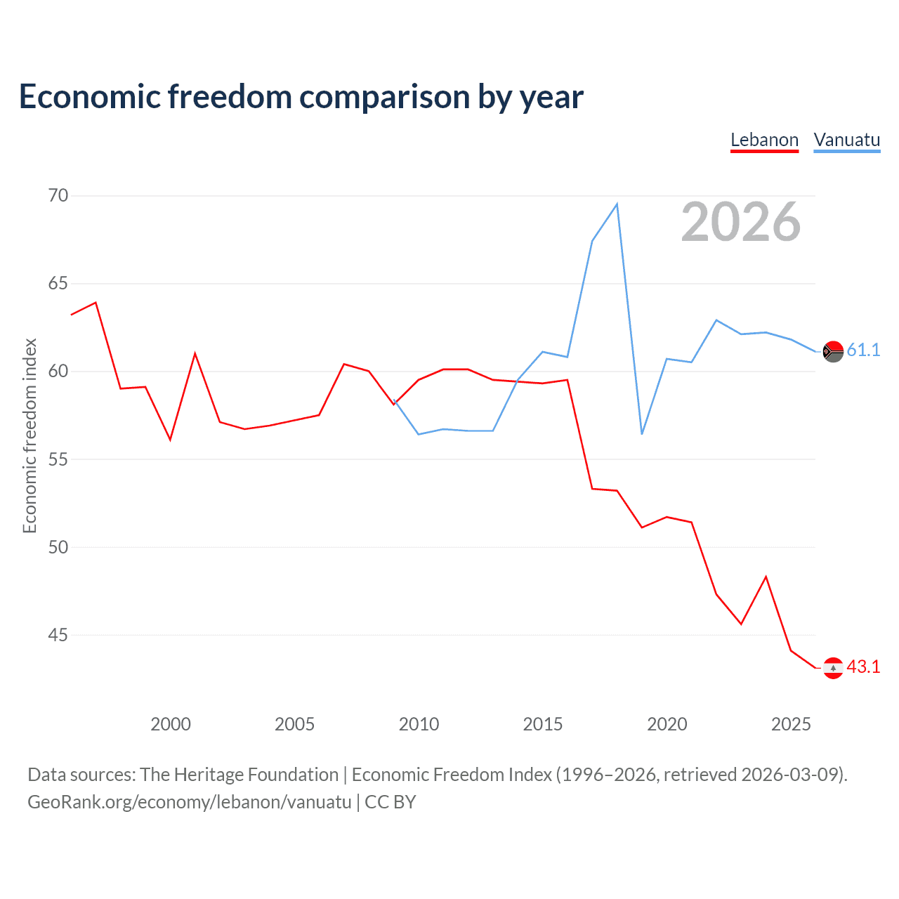 The Economic Freedom Index for Lebanon is 44.1, ranking 181/197, compared to 61.8 for Vanuatu, ranking 86/197. The chart below displays a comparison of annual changes in economic freedom indexes.