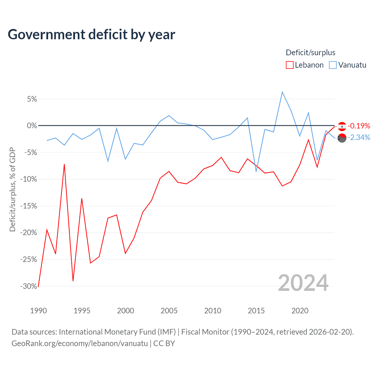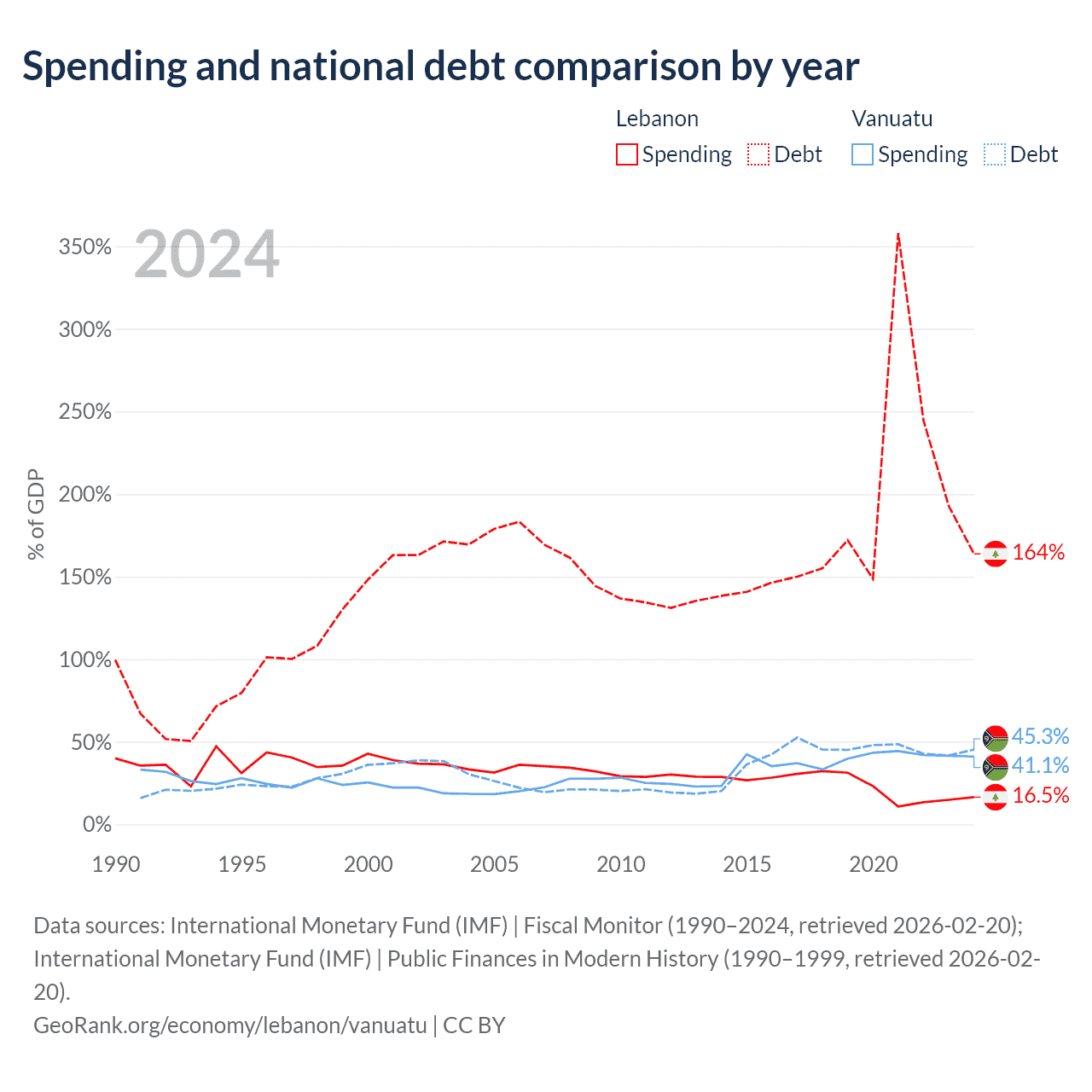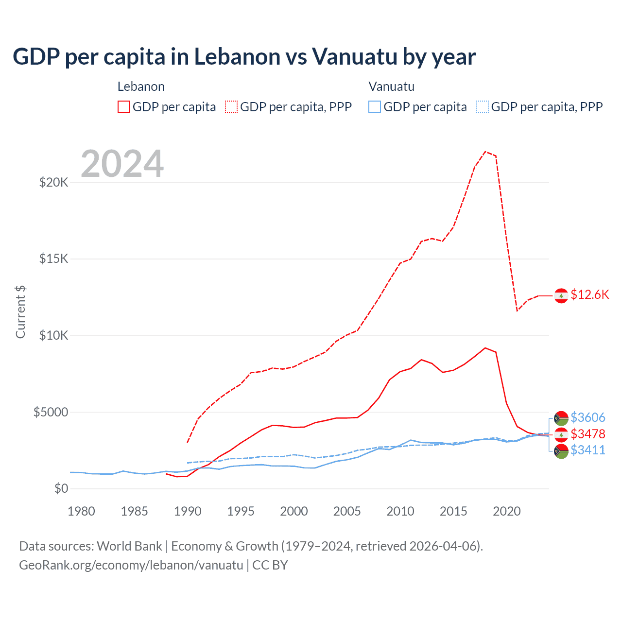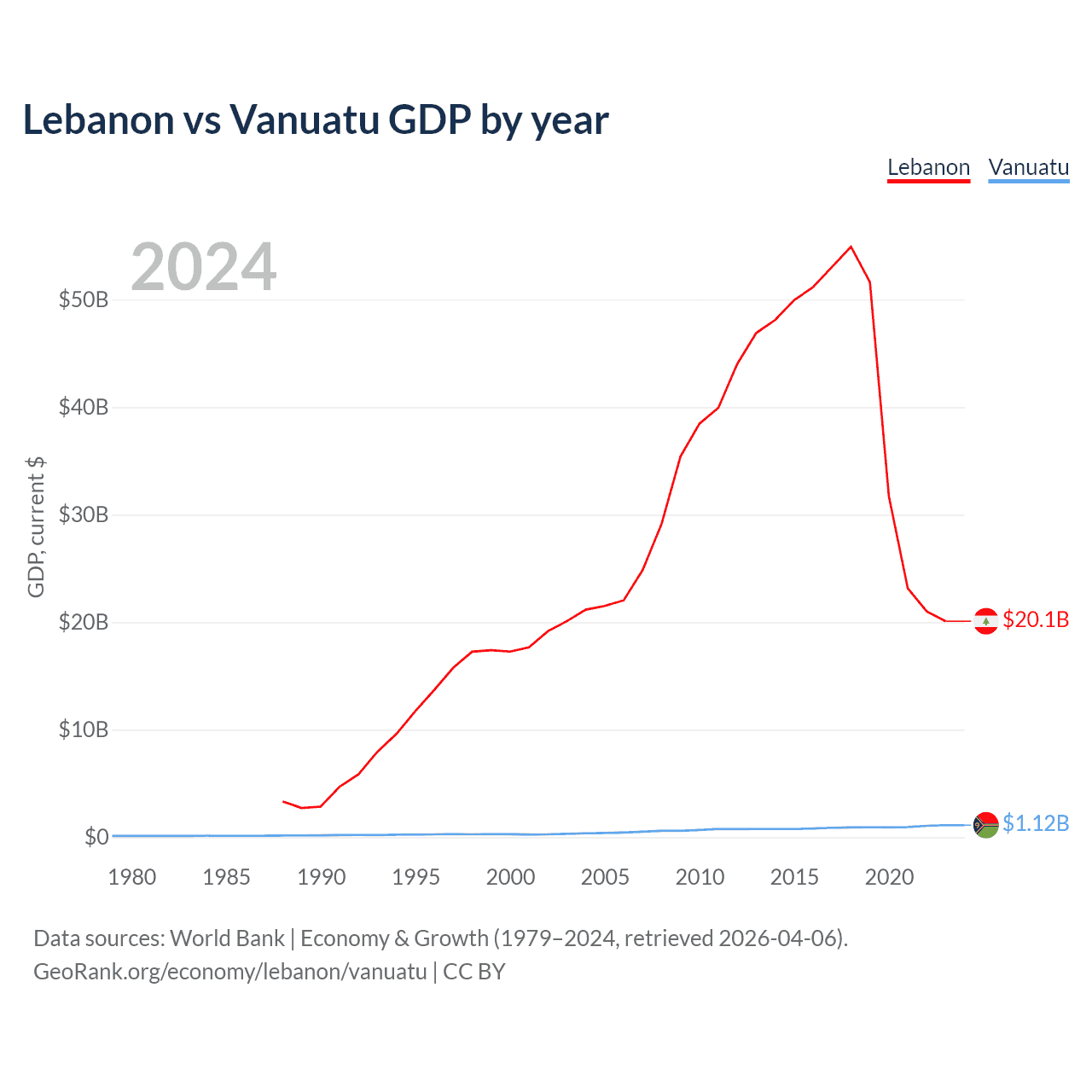 Lebanon has a GDP of $20.1B compared to $1.12B for Vanuatu, ranking 128/197 and 188/197 by economy size, respectively.