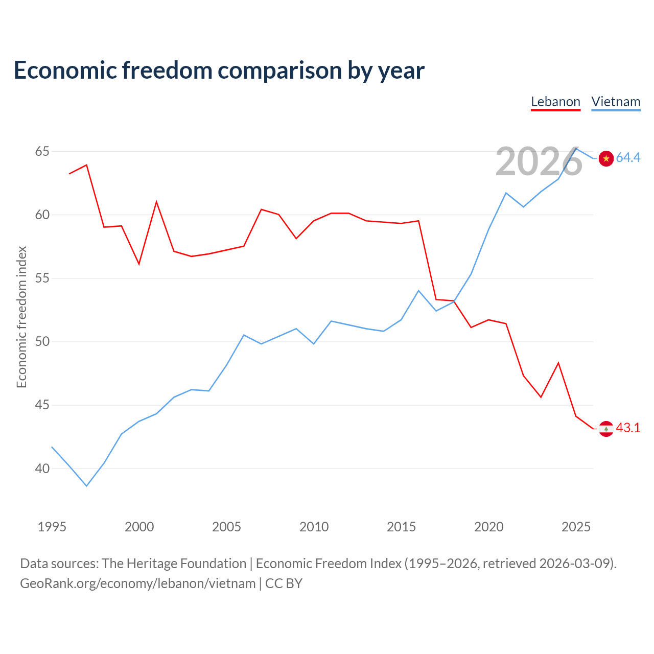 The Economic Freedom Index for Lebanon is 43.1, ranking 183/197, compared to 64.4 for Vietnam, ranking 73/197. The chart above displays a comparison of annual changes in economic freedom indexes.