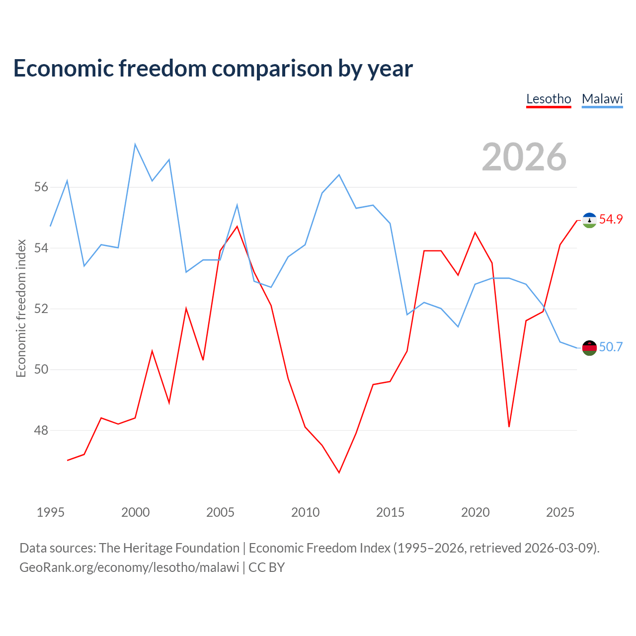 The Economic Freedom Index for Lesotho is 54.9, ranking 130/197, compared to 50.7 for Malawi, ranking 159/197. The chart above displays a comparison of annual changes in economic freedom indexes.