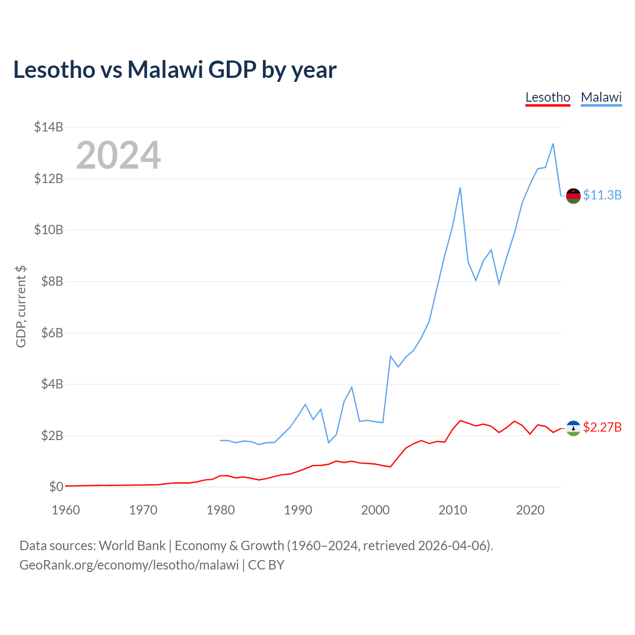 Lesotho has a GDP of $2.27B compared to $11.3B for Malawi, ranking 175/197 and 151/197 by economy size, respectively.