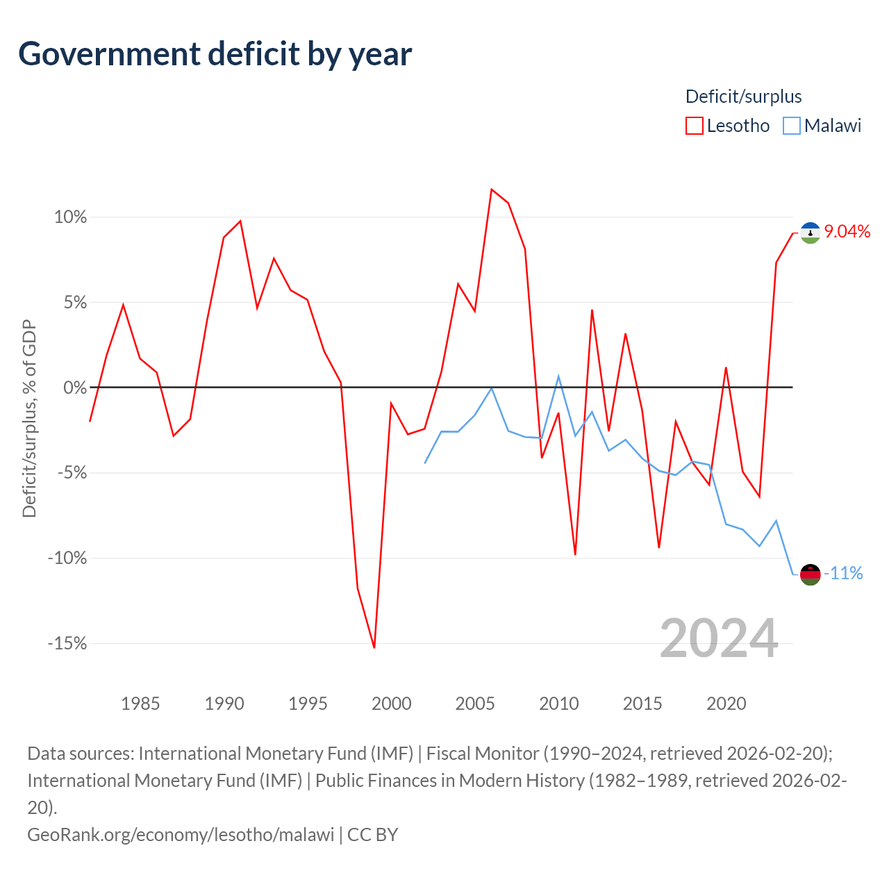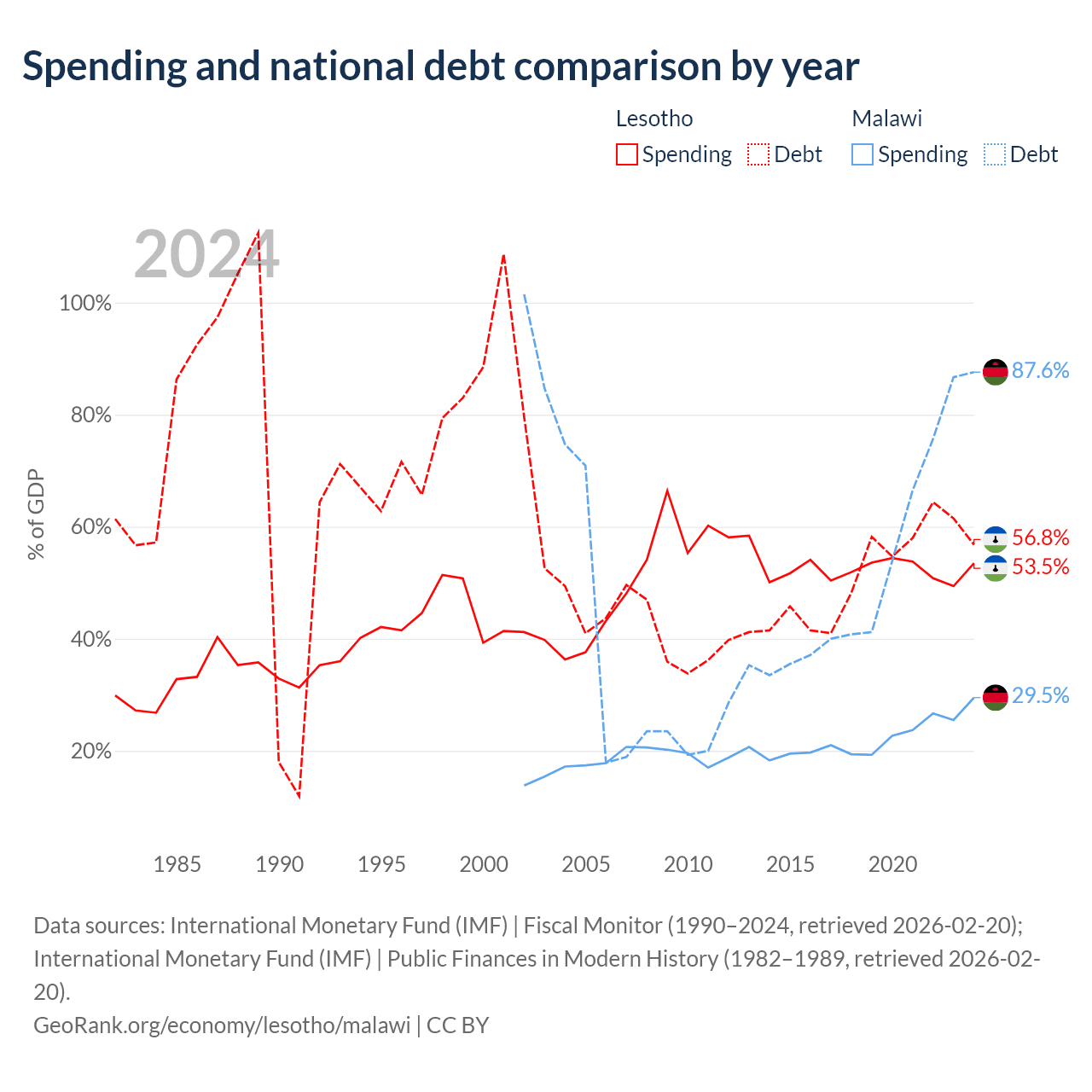 Lesotho has $1.29B in government debt (56.8% of GDP), compared to $9.91B (87.6% of GDP) in Malawi.