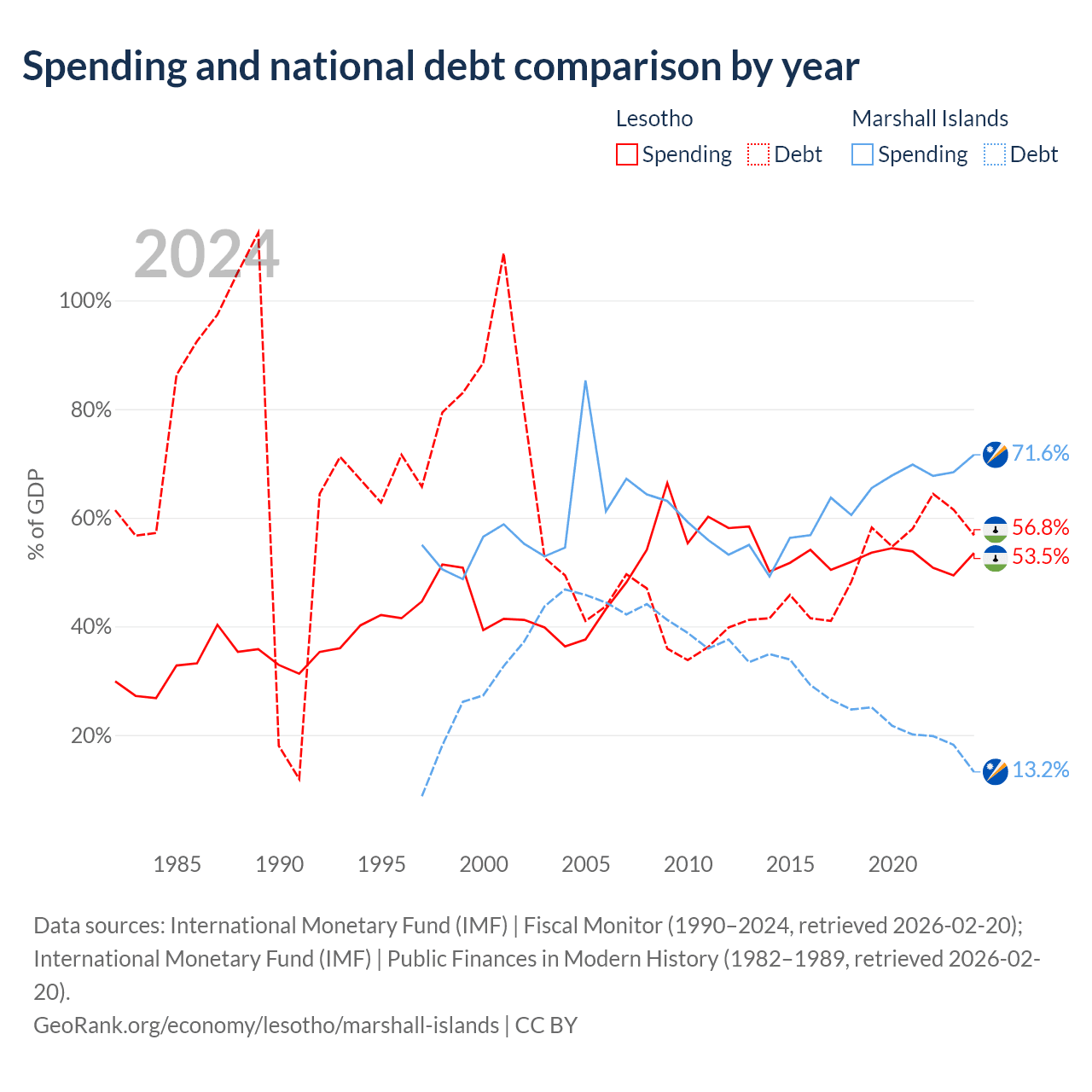 Lesotho has $1.29B in government debt (56.8% of GDP), compared to $38.4M (13.2% of GDP) in the Marshall Islands.