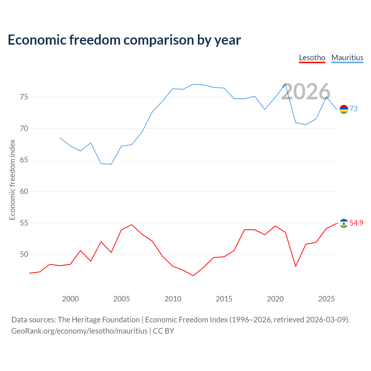 The Economic Freedom Index for Lesotho is 54.9, ranking 130/197, compared to 73 for Mauritius, ranking 26/197. The chart above displays a comparison of annual changes in economic freedom indexes.