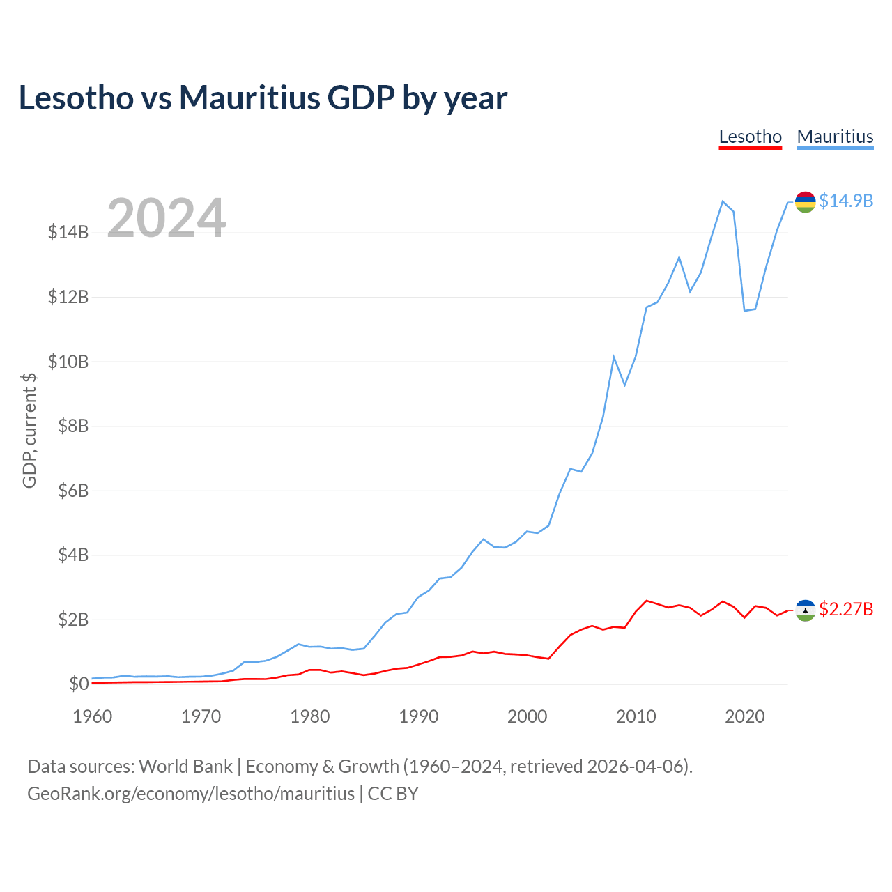 Lesotho has a GDP of $2.27B compared to $14.9B for Mauritius, ranking 175/197 and 143/197 by economy size, respectively.