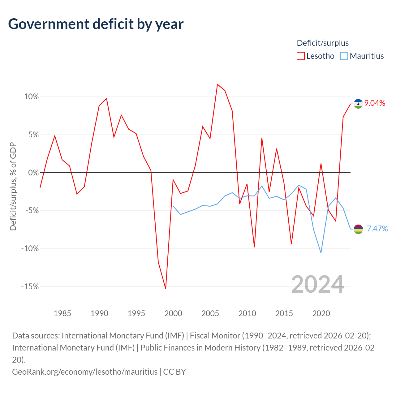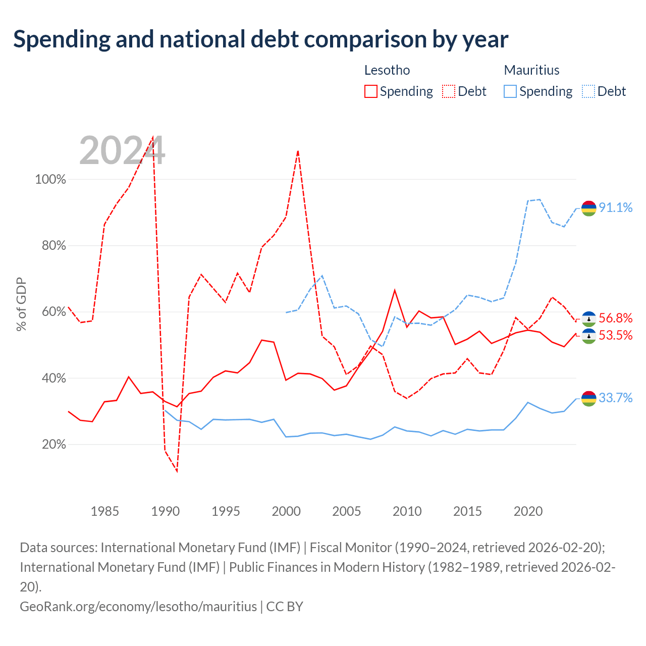 Lesotho has $1.29B in government debt (56.8% of GDP), compared to $13.6B (91.1% of GDP) in Mauritius.
