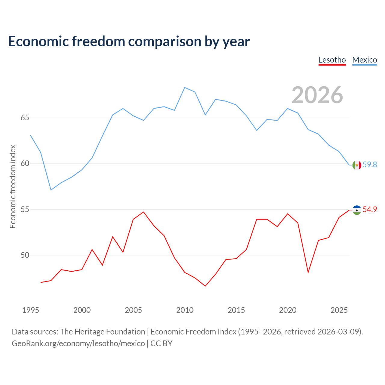 The Economic Freedom Index for Lesotho is 54.9, ranking 130/197, compared to 59.8 for Mexico, ranking 102/197. The chart above displays a comparison of annual changes in economic freedom indexes.