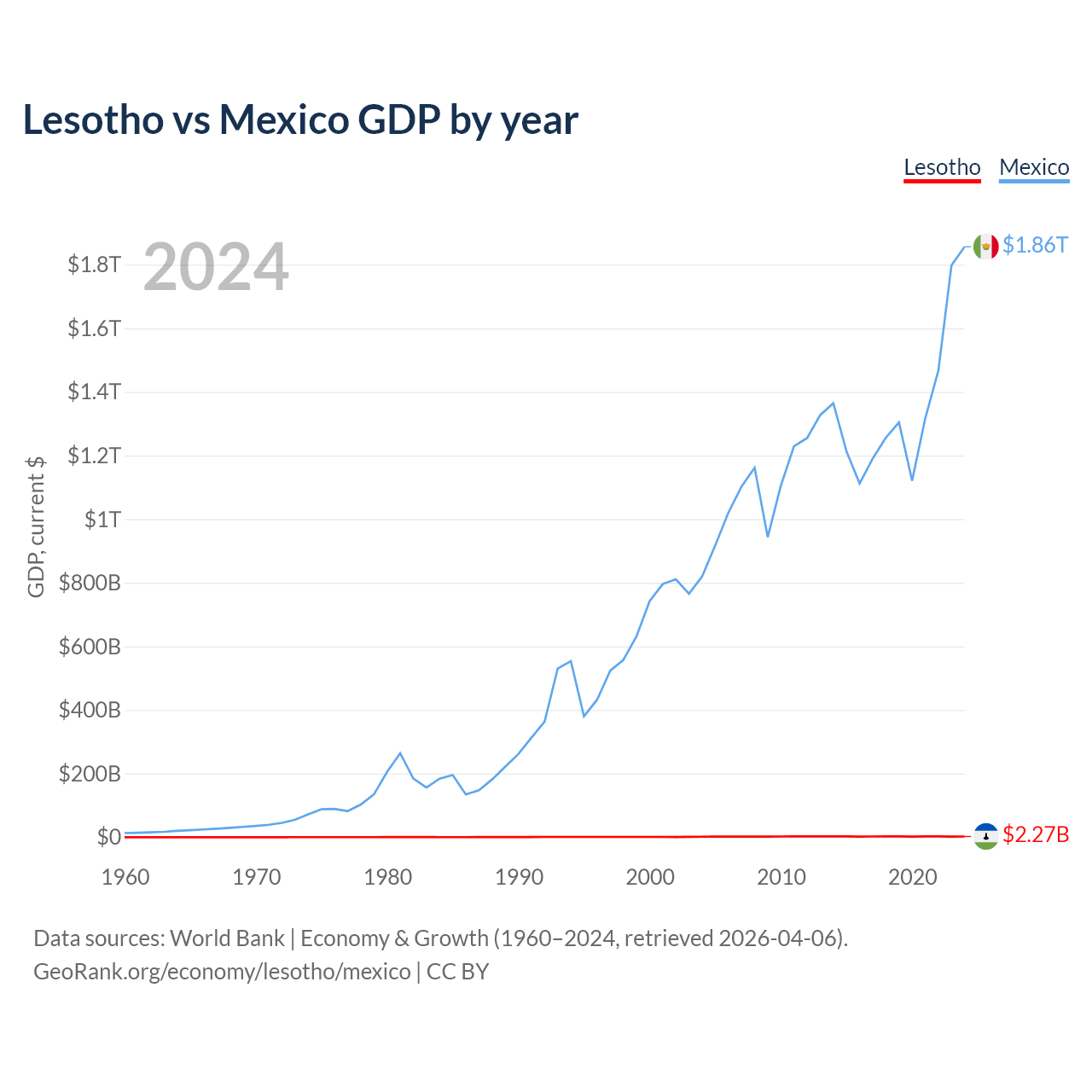 Lesotho has a GDP of $2.27B compared to $1.86T for Mexico, ranking 175/197 and 13/197 by economy size, respectively.