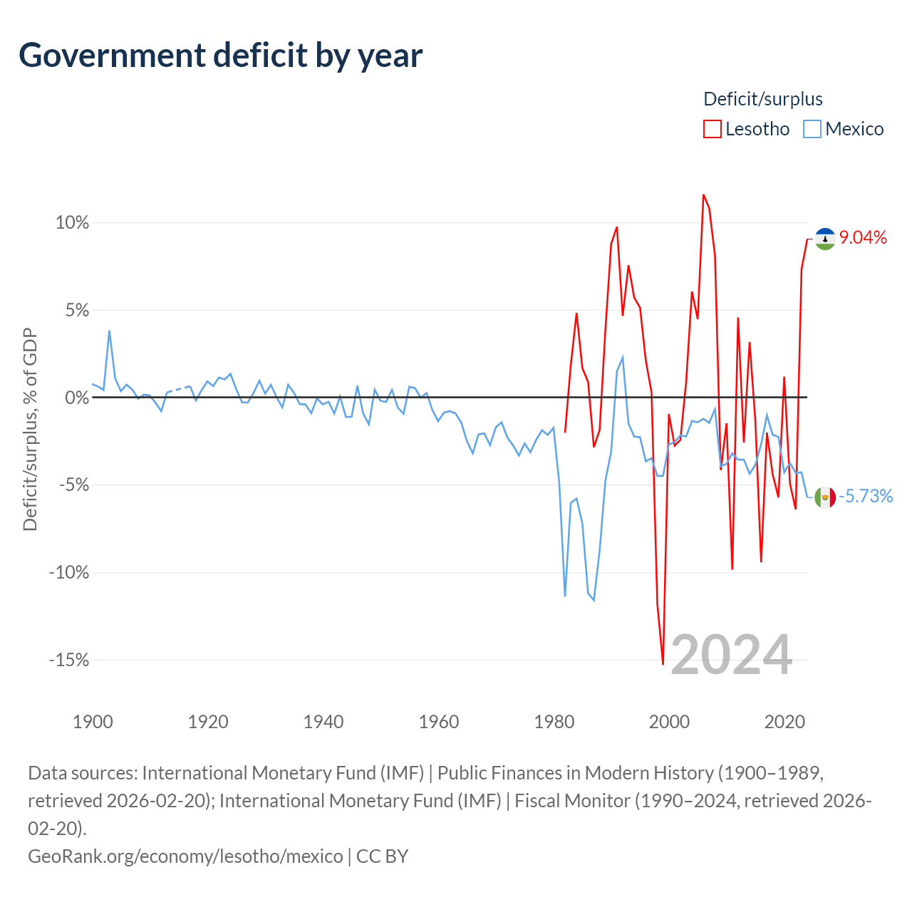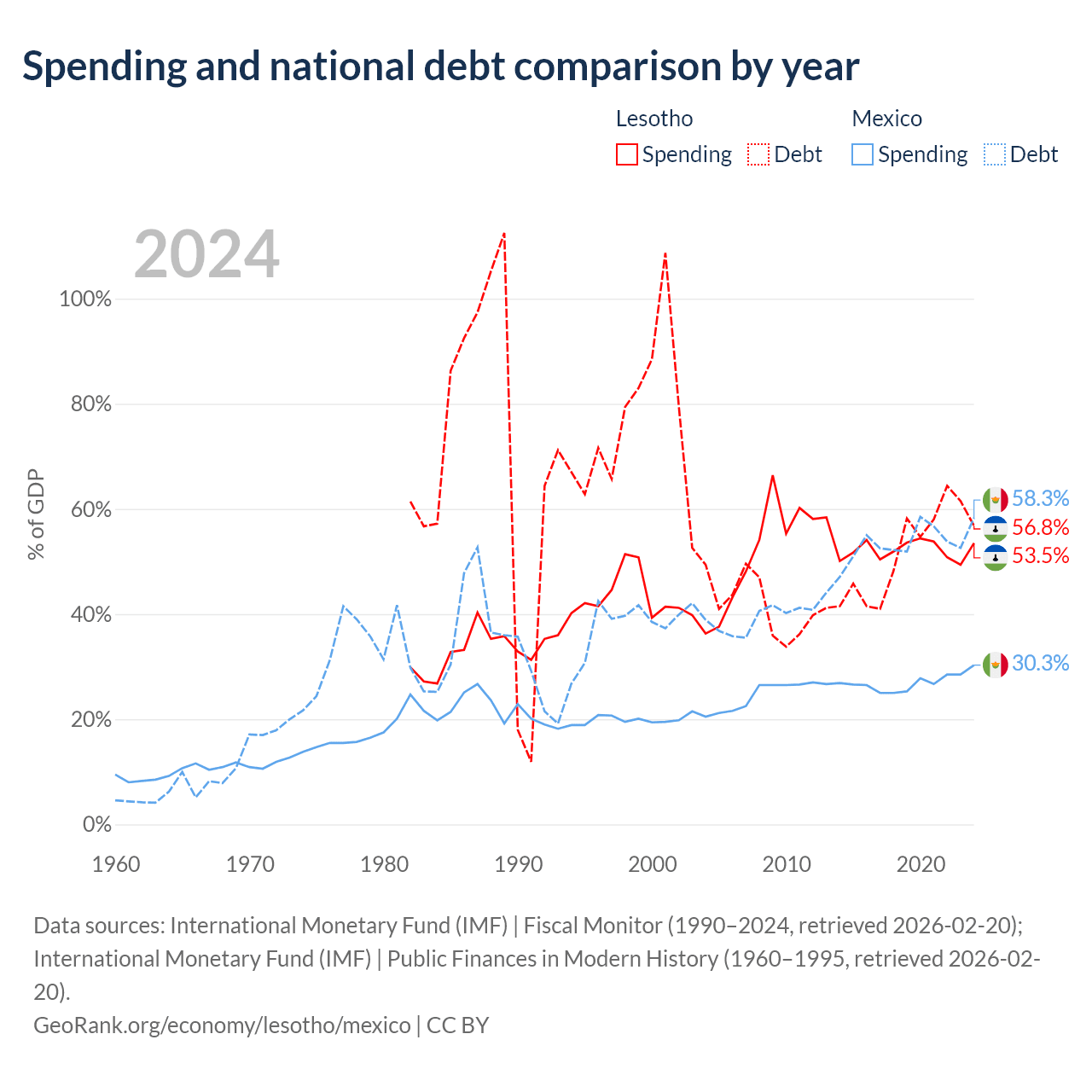 Lesotho has $1.29B in government debt (56.8% of GDP), compared to $1.08T (58.3% of GDP) in Mexico.