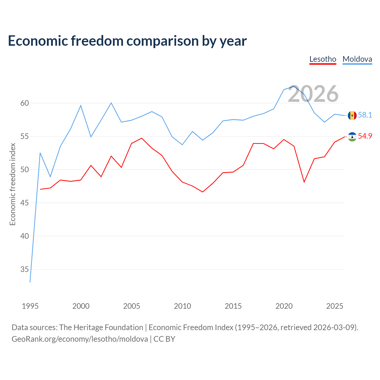 The Economic Freedom Index for Lesotho is 54.9, ranking 130/197, compared to 58.1 for Moldova, ranking 112/197. The chart above displays a comparison of annual changes in economic freedom indexes.
