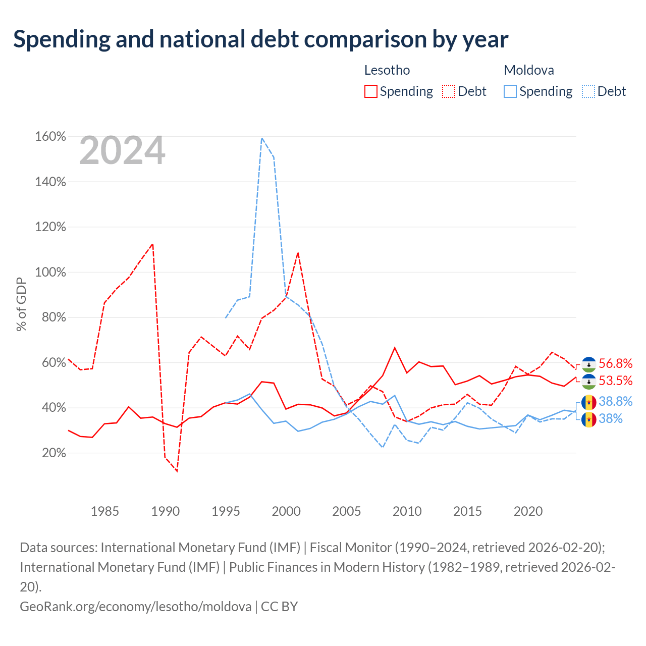 Lesotho has $1.29B in government debt (56.8% of GDP), compared to $7.06B (38.8% of GDP) in Moldova.