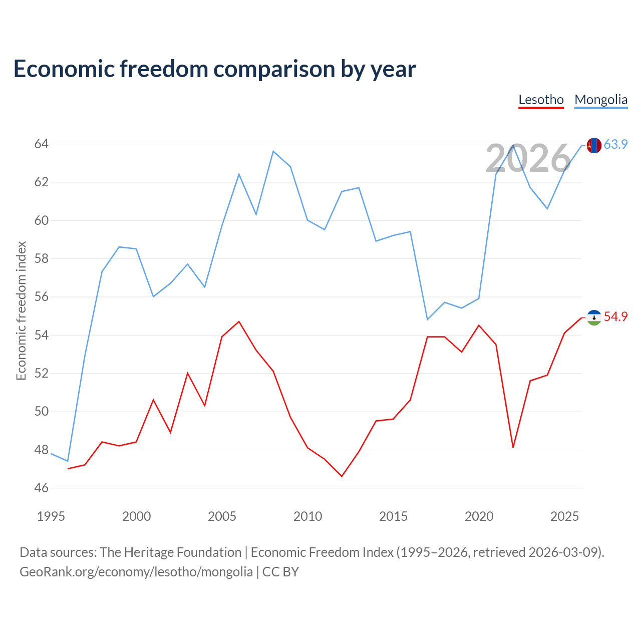 The Economic Freedom Index for Lesotho is 54.9, ranking 130/197, compared to 63.9 for Mongolia, ranking 76/197. The chart above displays a comparison of annual changes in economic freedom indexes.
