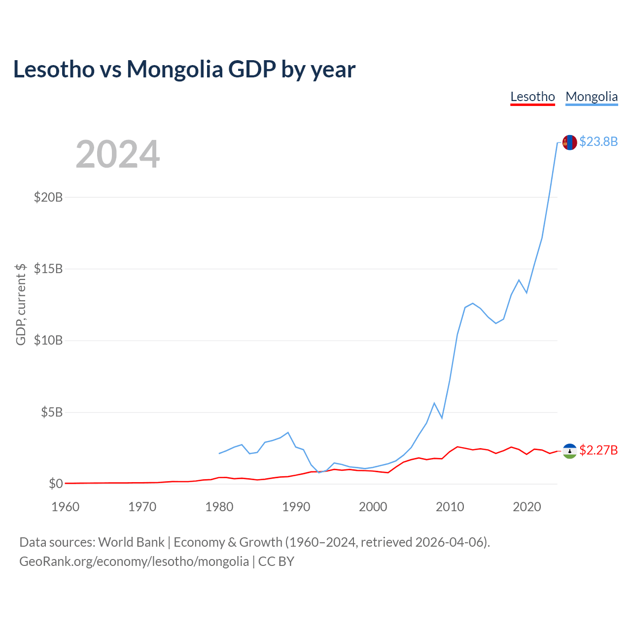 Lesotho has a GDP of $2.27B compared to $23.8B for Mongolia, ranking 175/197 and 121/197 by economy size, respectively.