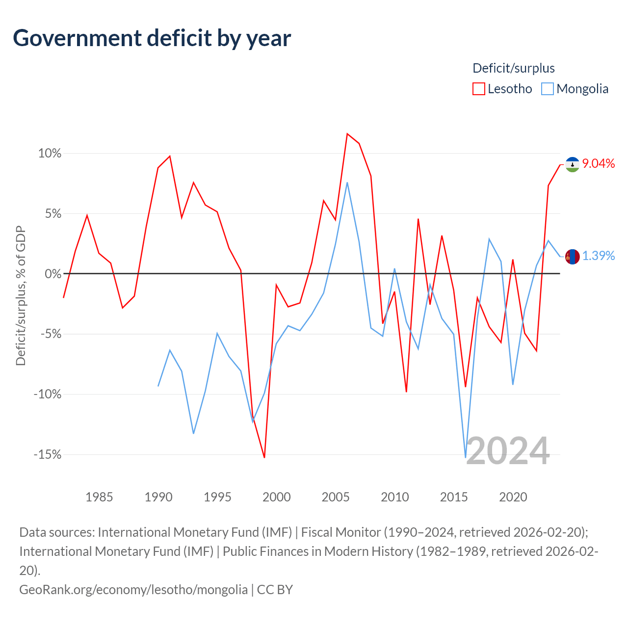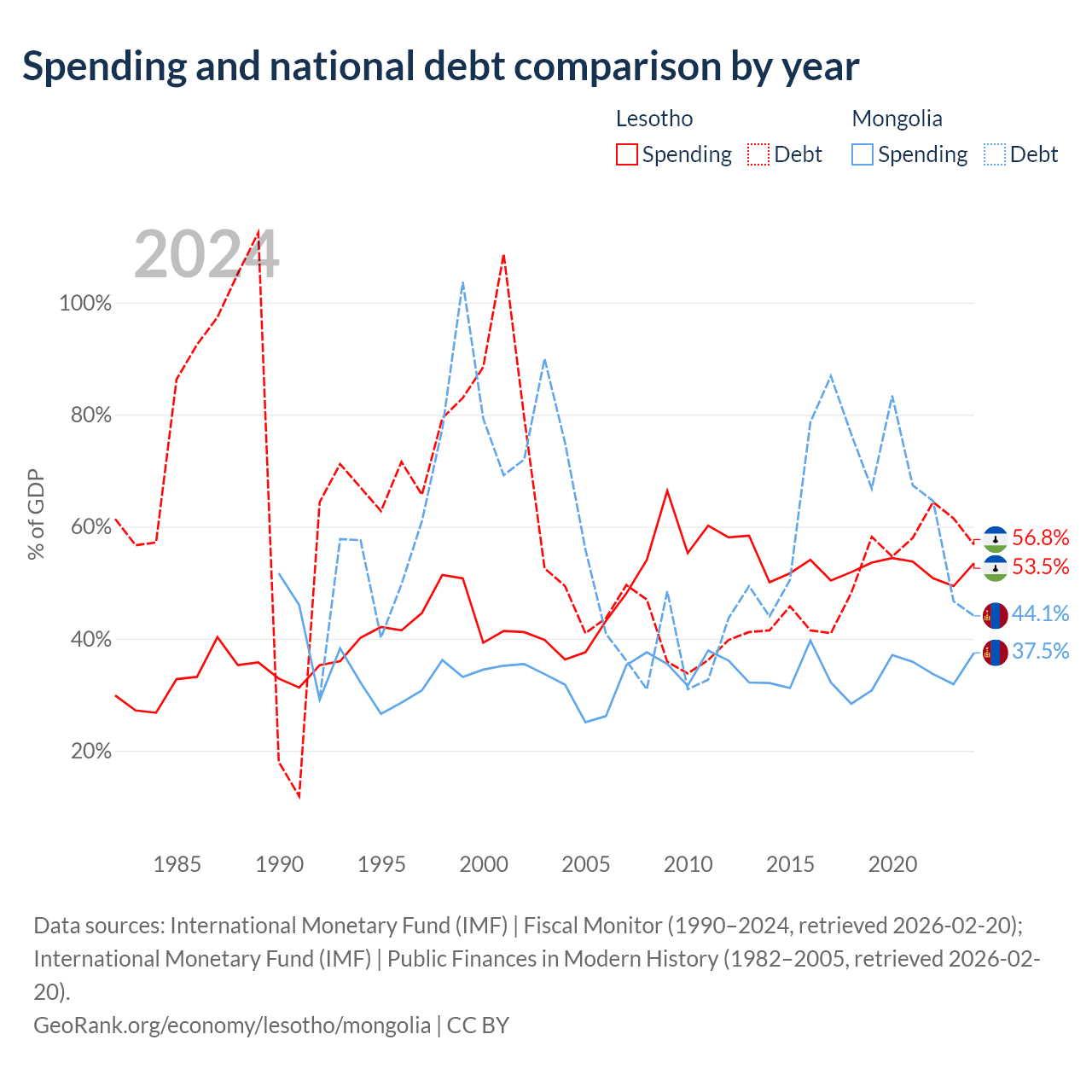 Lesotho has $1.29B in government debt (56.8% of GDP), compared to $10.5B (44.1% of GDP) in Mongolia.