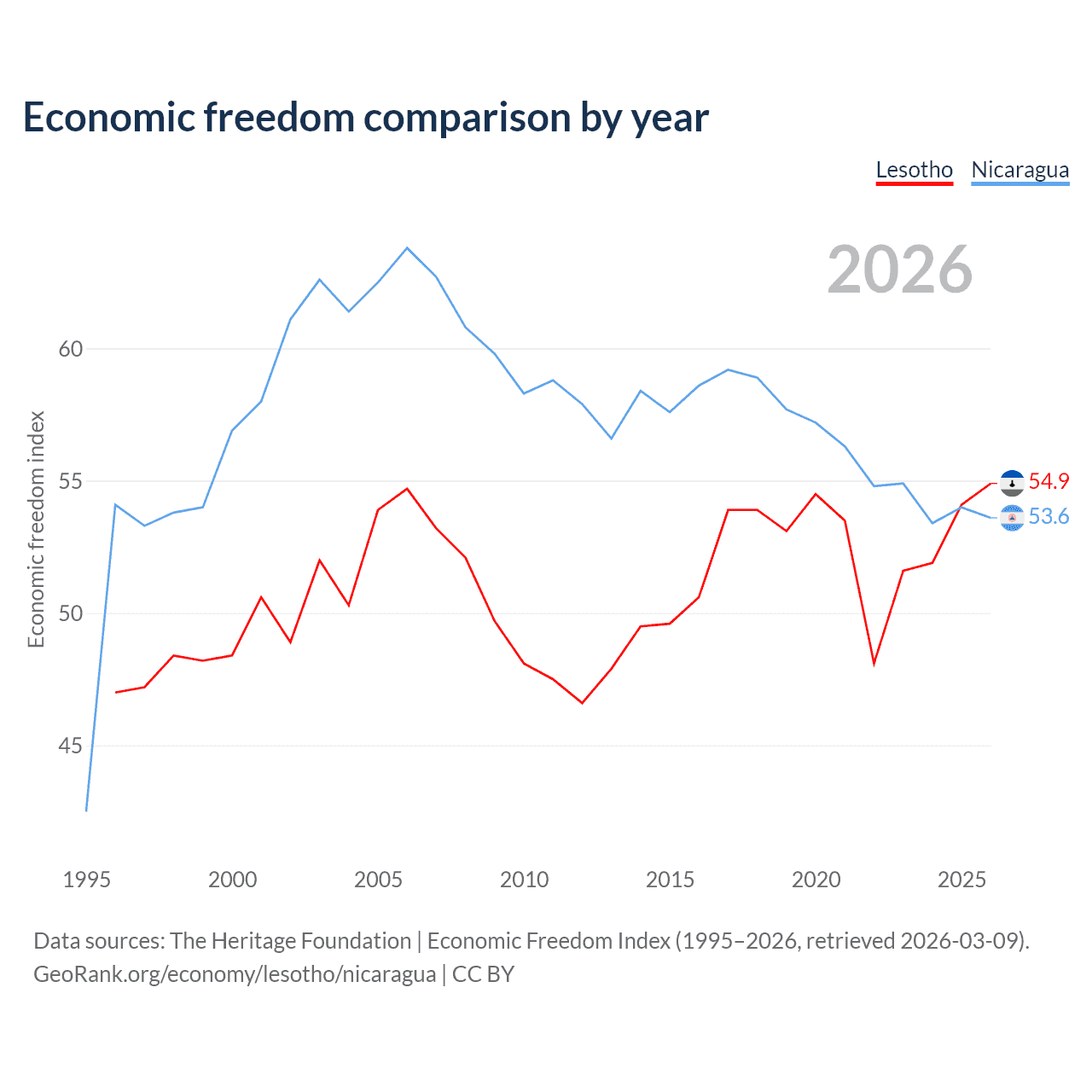 The Economic Freedom Index for Lesotho is 54.9, ranking 130/197, compared to 53.6 for Nicaragua, ranking 139/197. The chart above displays a comparison of annual changes in economic freedom indexes.