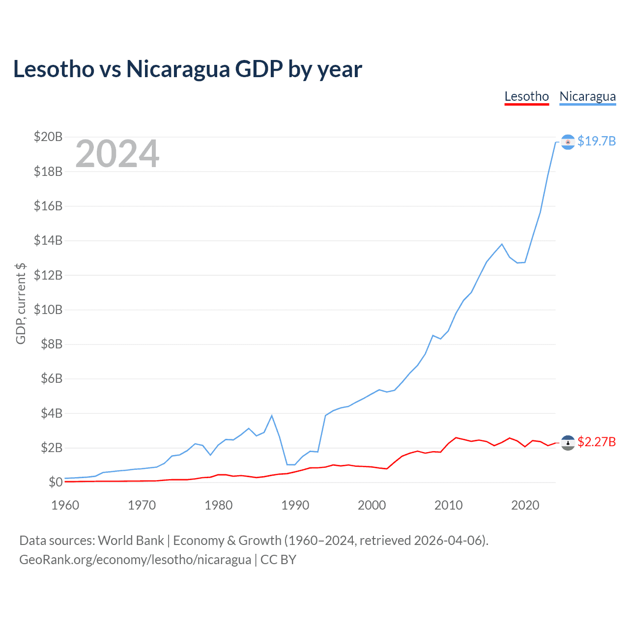 Lesotho has a GDP of $2.27B compared to $19.7B for Nicaragua, ranking 175/197 and 131/197 by economy size, respectively.
