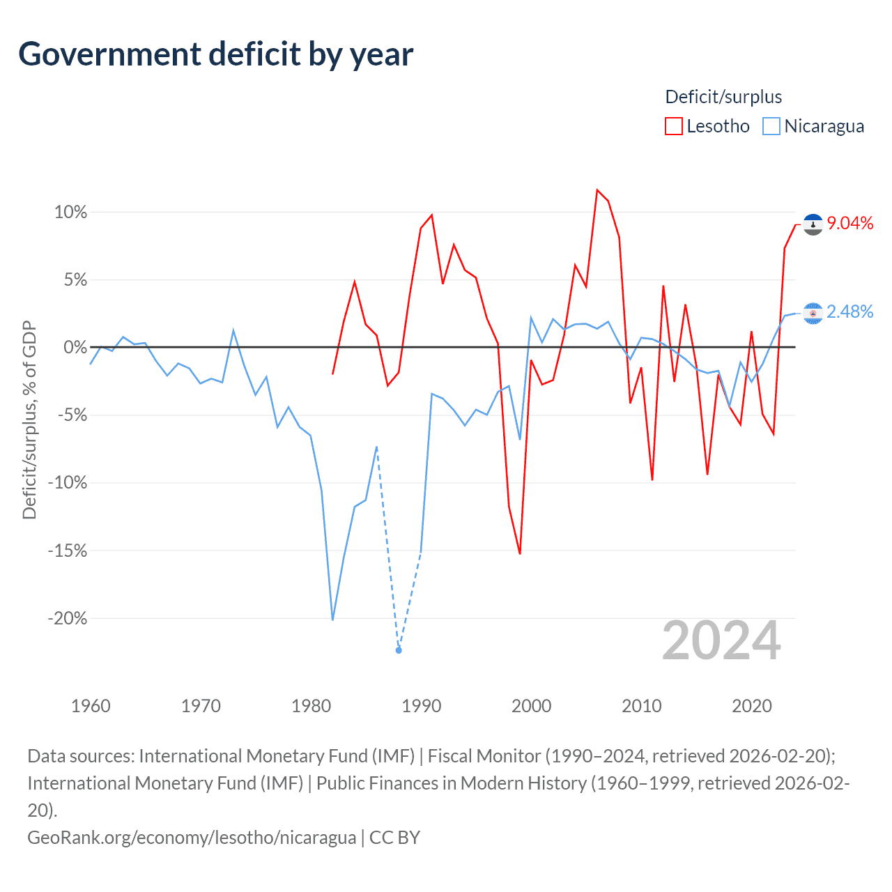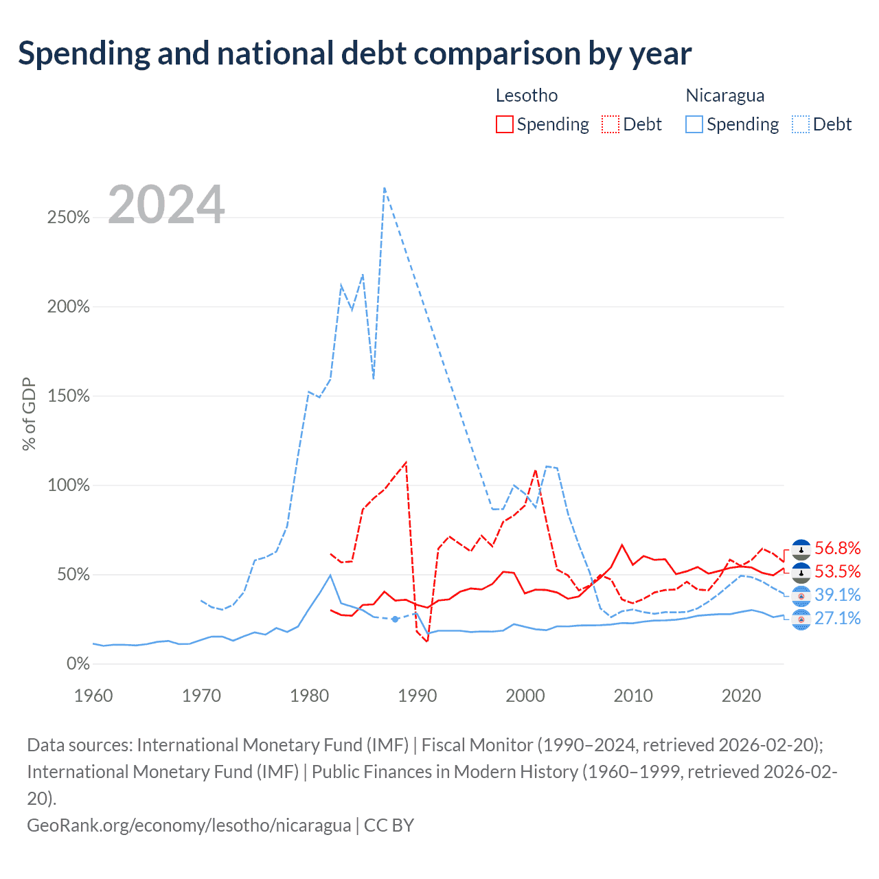 Lesotho has $1.29B in government debt (56.8% of GDP), compared to $7.71B (39.1% of GDP) in Nicaragua.