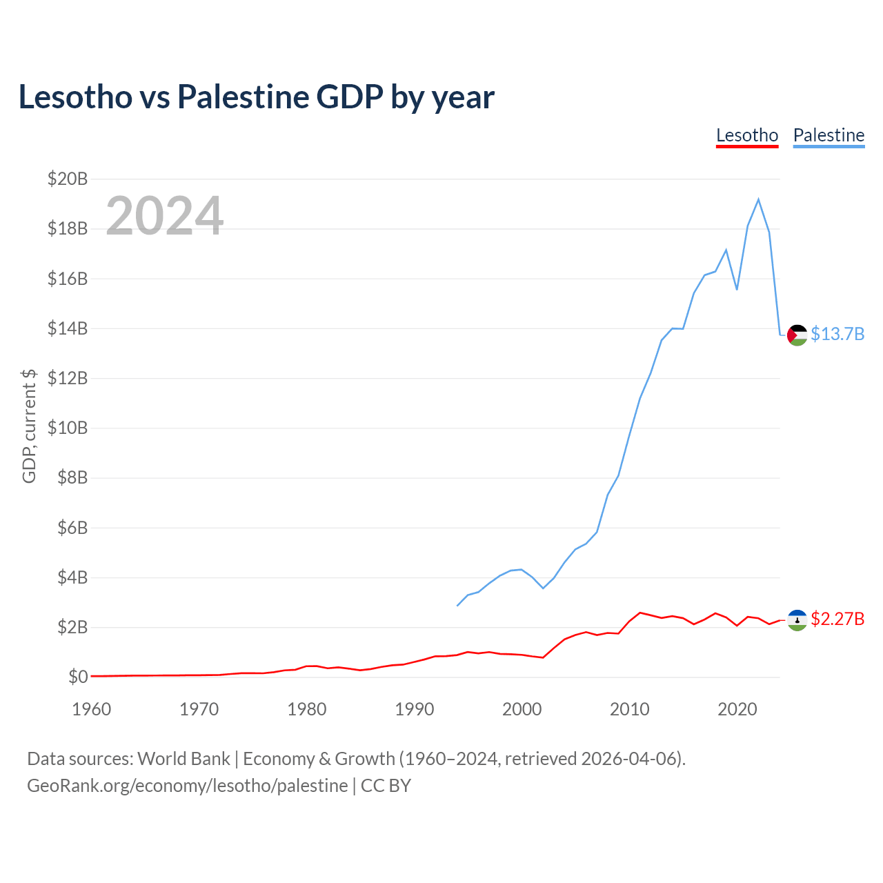 Lesotho has a GDP of $2.27B compared to $13.7B for Palestine, ranking 175/197 and 146/197 by economy size, respectively.