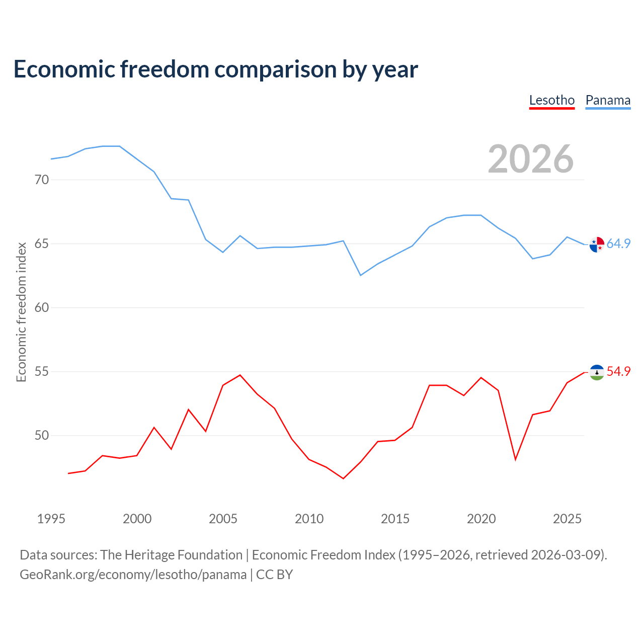 The Economic Freedom Index for Lesotho is 54.9, ranking 130/197, compared to 64.9 for Panama, ranking 70/197. The chart above displays a comparison of annual changes in economic freedom indexes.