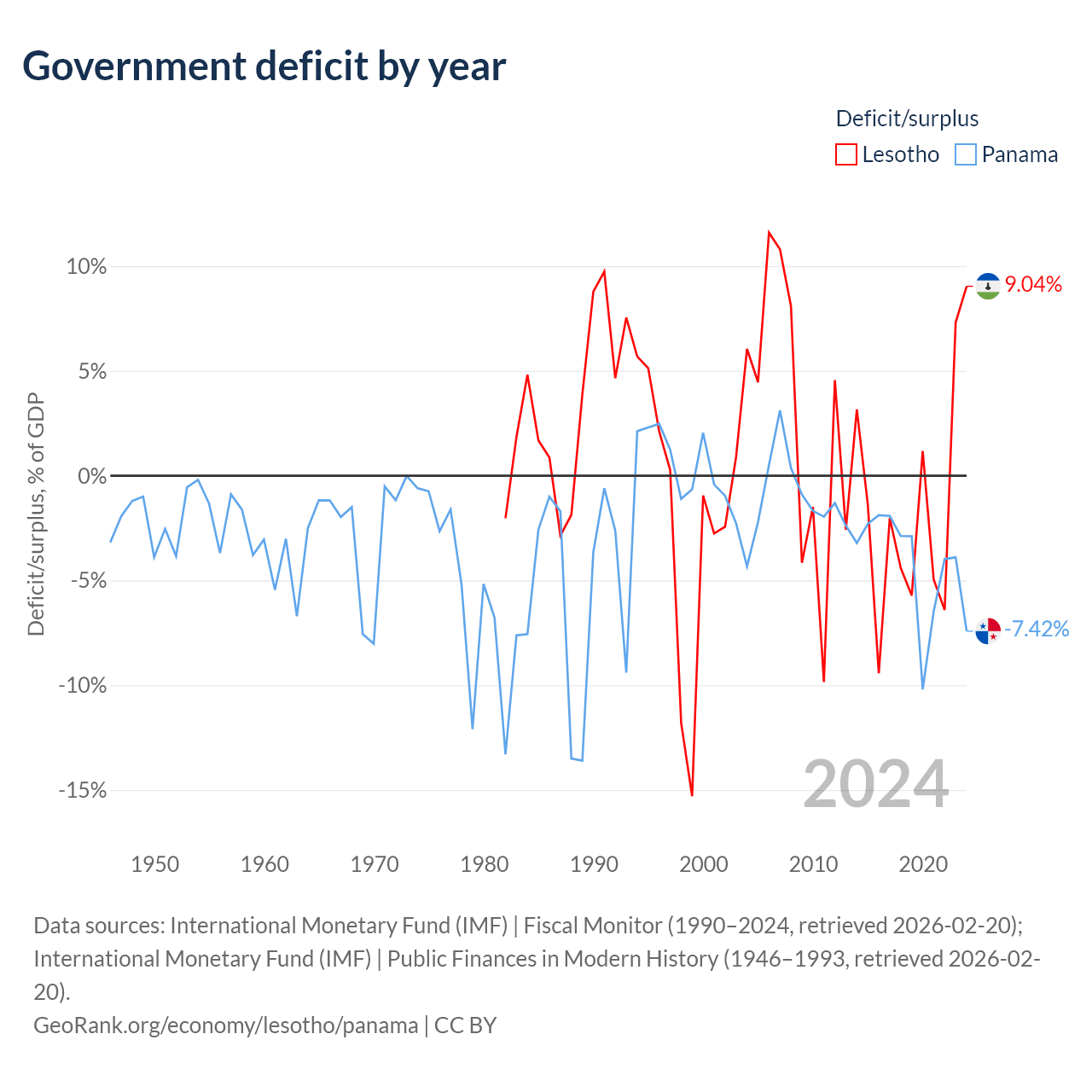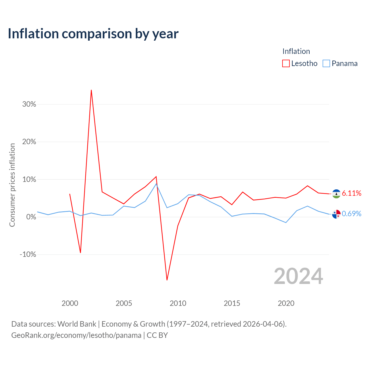 Lesotho has a GDP of $2.27B compared to $86.5B for Panama, ranking 175/197 and 78/197 by economy size, respectively.