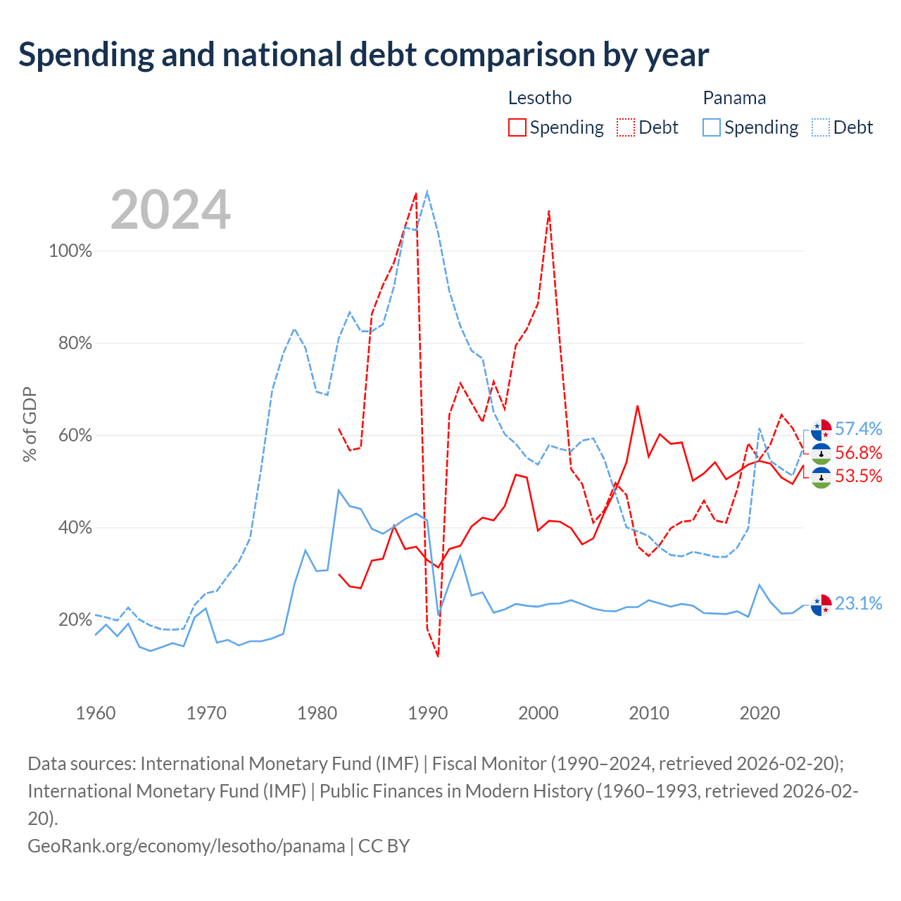 Lesotho has $1.29B in government debt (56.8% of GDP), compared to $49.6B (57.4% of GDP) in Panama.