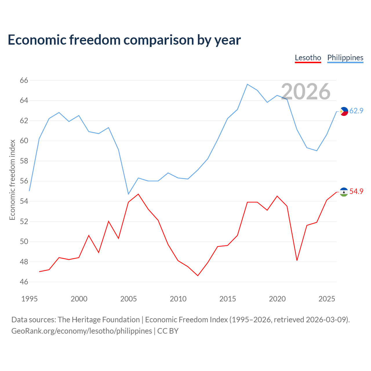 The Economic Freedom Index for Lesotho is 54.9, ranking 130/197, compared to 62.9 for the Philippines, ranking 85/197. The chart above displays a comparison of annual changes in economic freedom indexes.