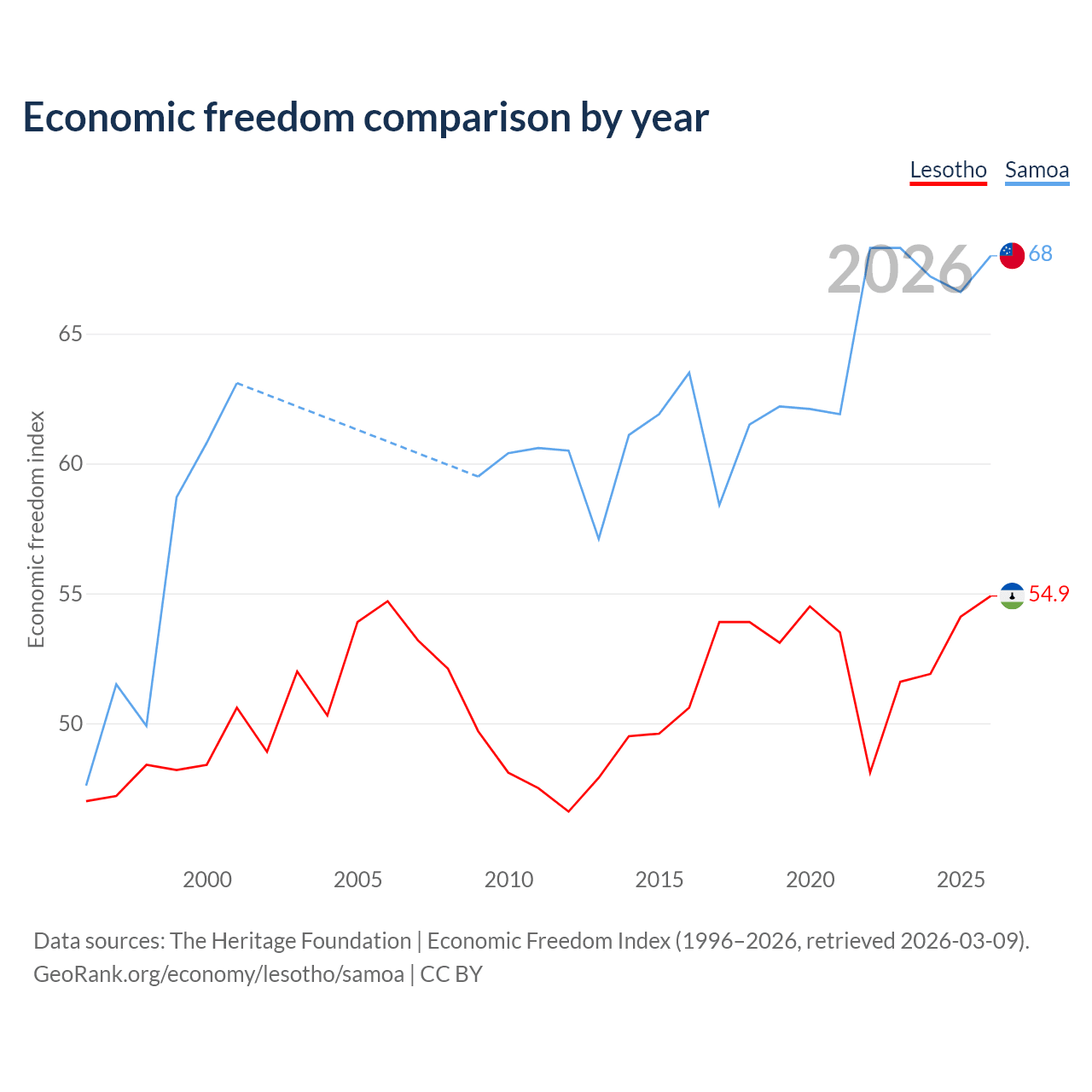 The Economic Freedom Index for Lesotho is 54.9, ranking 130/197, compared to 68 for Samoa, ranking 52/197. The chart above displays a comparison of annual changes in economic freedom indexes.