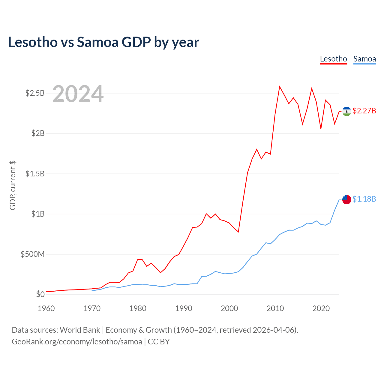 Lesotho has a GDP of $2.27B compared to $1.18B for Samoa, ranking 175/197 and 185/197 by economy size, respectively.