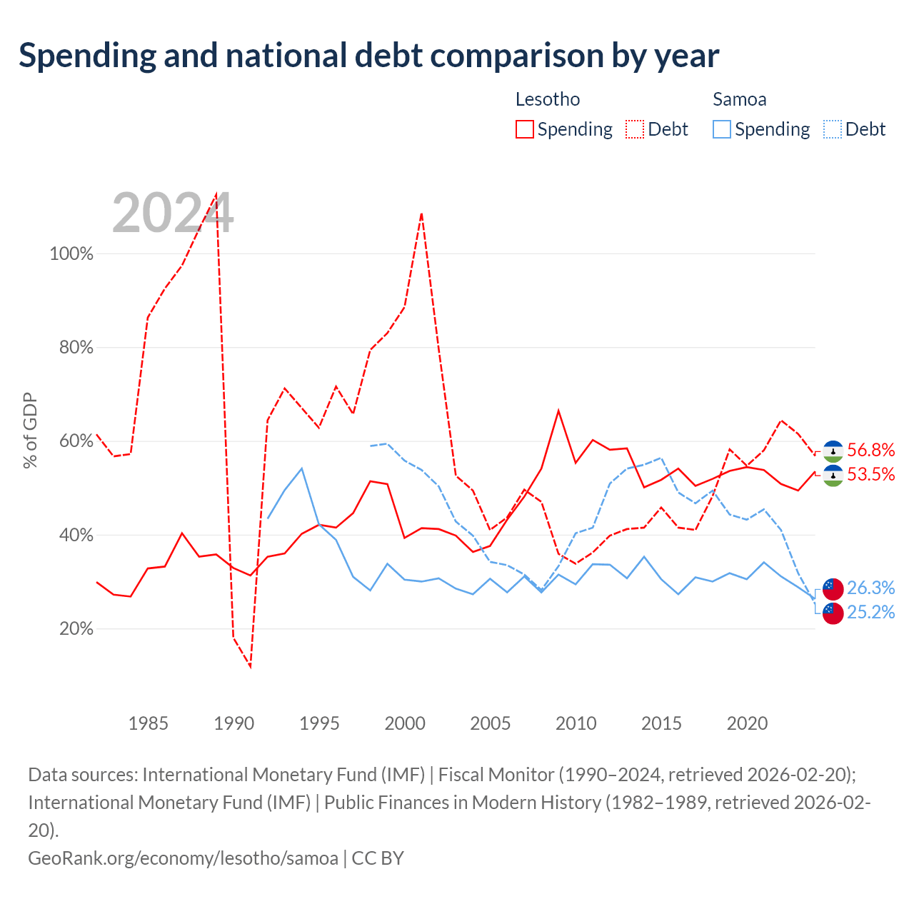 Lesotho has $1.29B in government debt (56.8% of GDP), compared to $296M (25.2% of GDP) in Samoa.