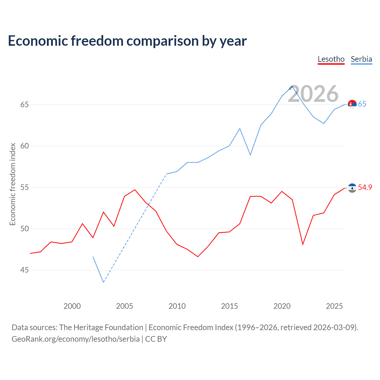 The Economic Freedom Index for Lesotho is 54.9, ranking 130/197, compared to 65 for Serbia, ranking 68/197. The chart above displays a comparison of annual changes in economic freedom indexes.