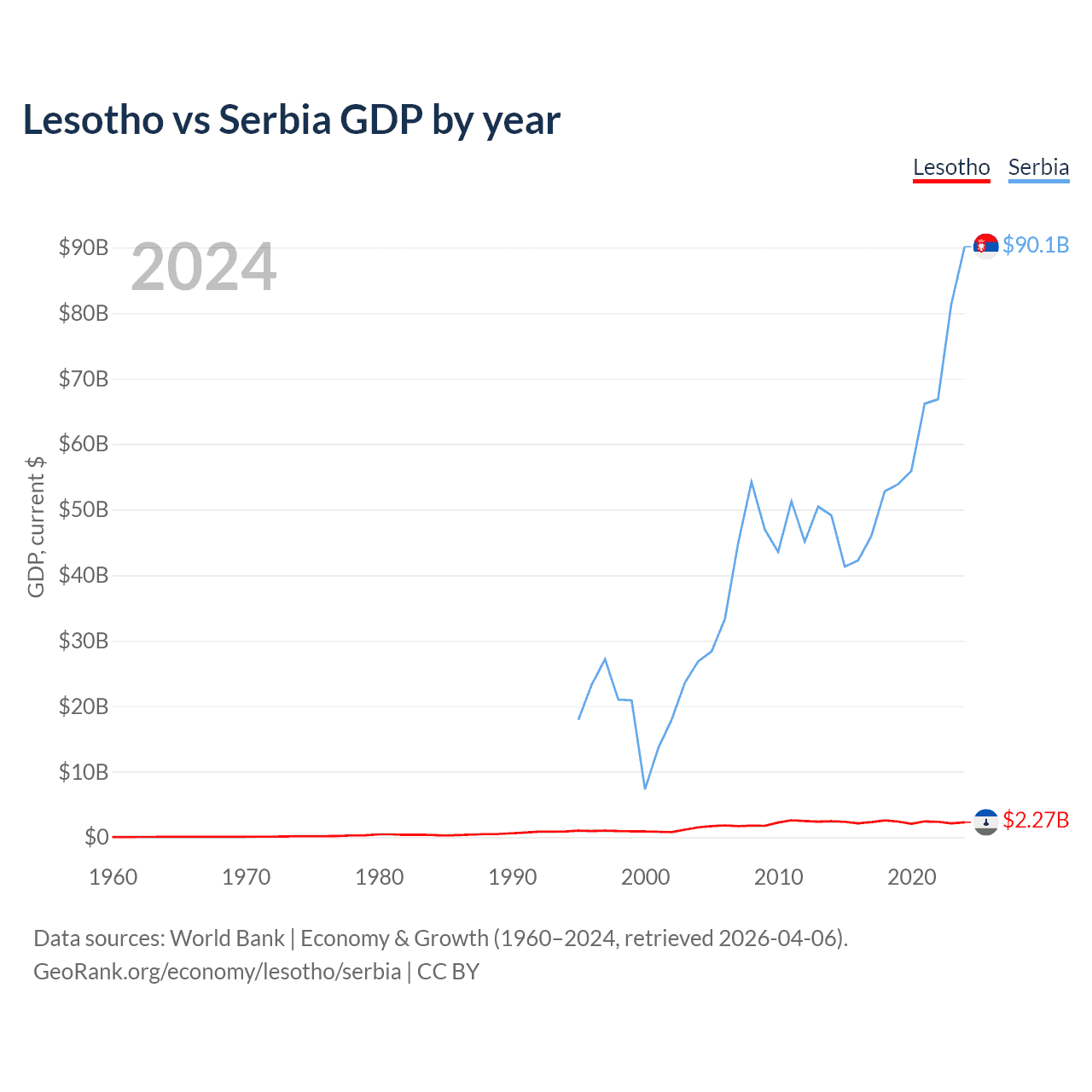 Lesotho has a GDP of $2.27B compared to $90.1B for Serbia, ranking 175/197 and 76/197 by economy size, respectively.