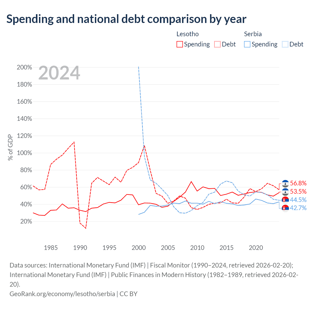Lesotho has $1.29B in government debt (56.8% of GDP), compared to $40.1B (44.5% of GDP) in Serbia.