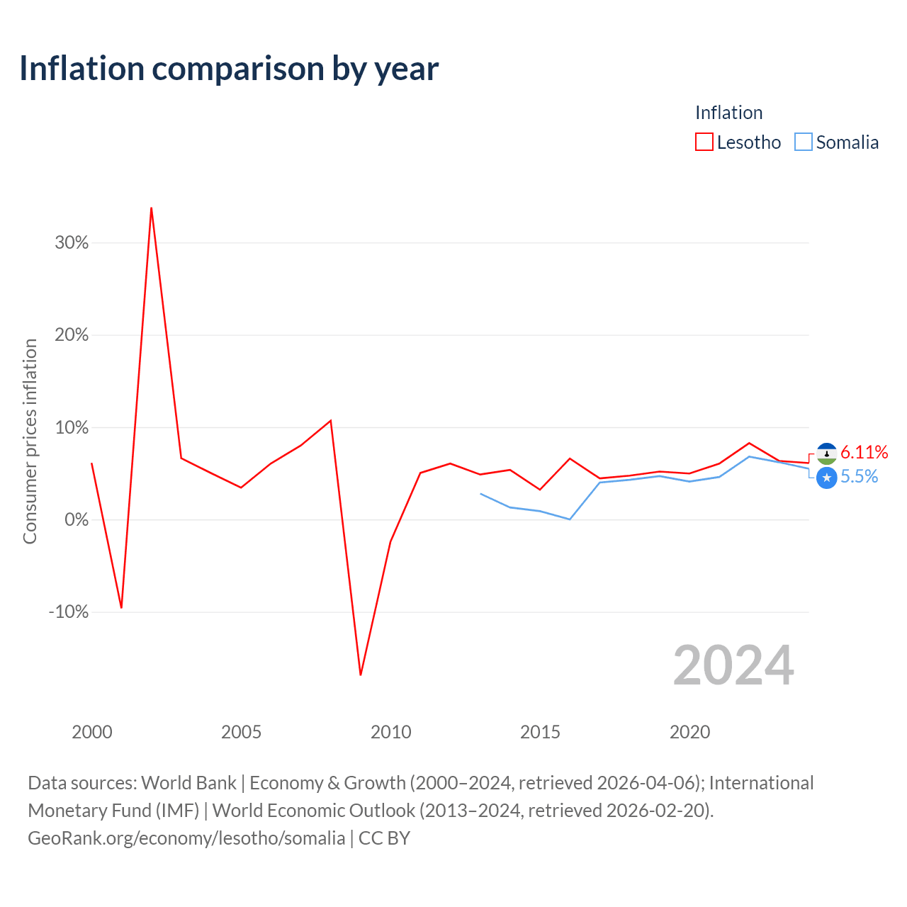 Over the past 12 years, Lesotho has recorded an average annual inflation rate of 5.52%, compared with 3.77% in Somalia. In 2024, inflation was 6.11% in Lesotho and 5.5% in Somalia.