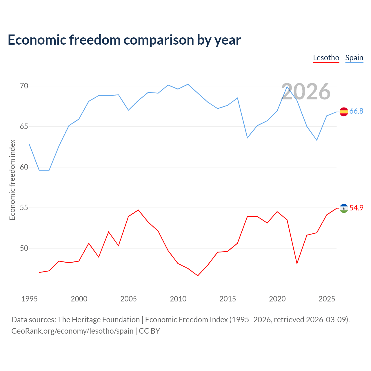 The Economic Freedom Index for Lesotho is 54.9, ranking 130/197, compared to 66.8 for Spain, ranking 59/197. The chart above displays a comparison of annual changes in economic freedom indexes.