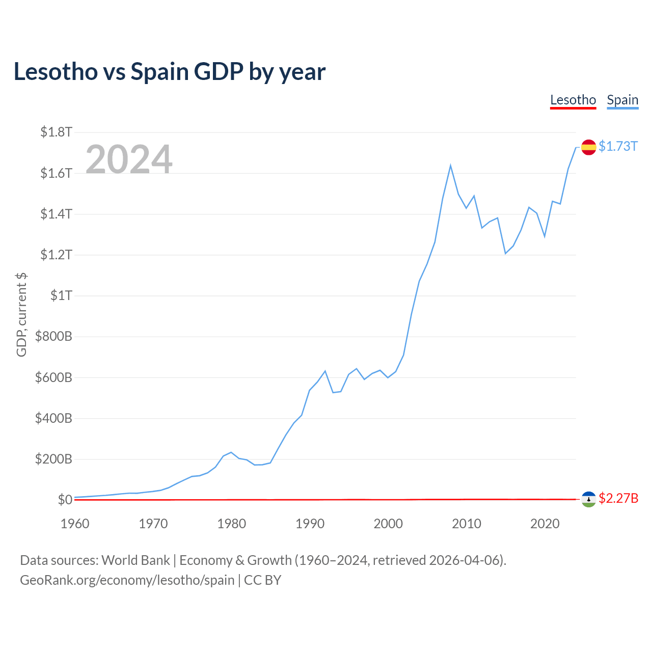 Lesotho has a GDP of $2.27B compared to $1.73T for Spain, ranking 175/197 and 15/197 by economy size, respectively.