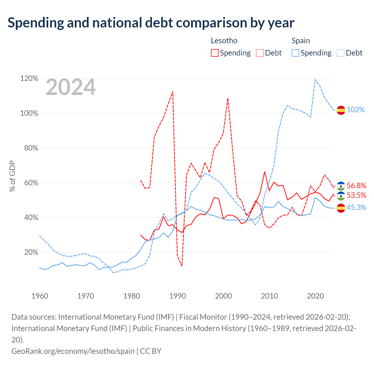 Lesotho has $1.29B in government debt (56.8% of GDP), compared to $1.75T (101.6% of GDP) in Spain.