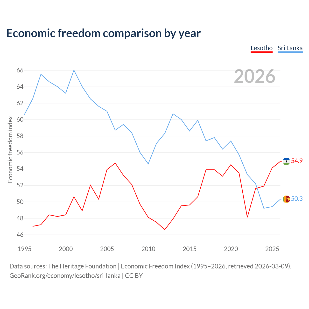 The Economic Freedom Index for Lesotho is 54.9, ranking 130/197, compared to 50.3 for Sri Lanka, ranking 162/197. The chart above displays a comparison of annual changes in economic freedom indexes.