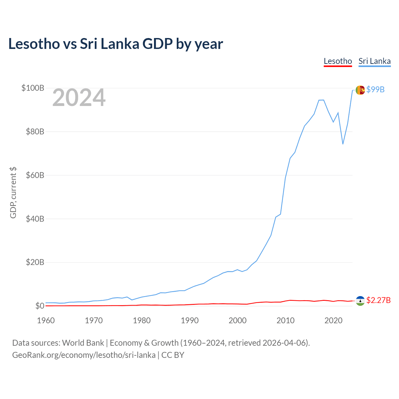 Lesotho has a GDP of $2.27B compared to $99B for Sri Lanka, ranking 175/197 and 72/197 by economy size, respectively.